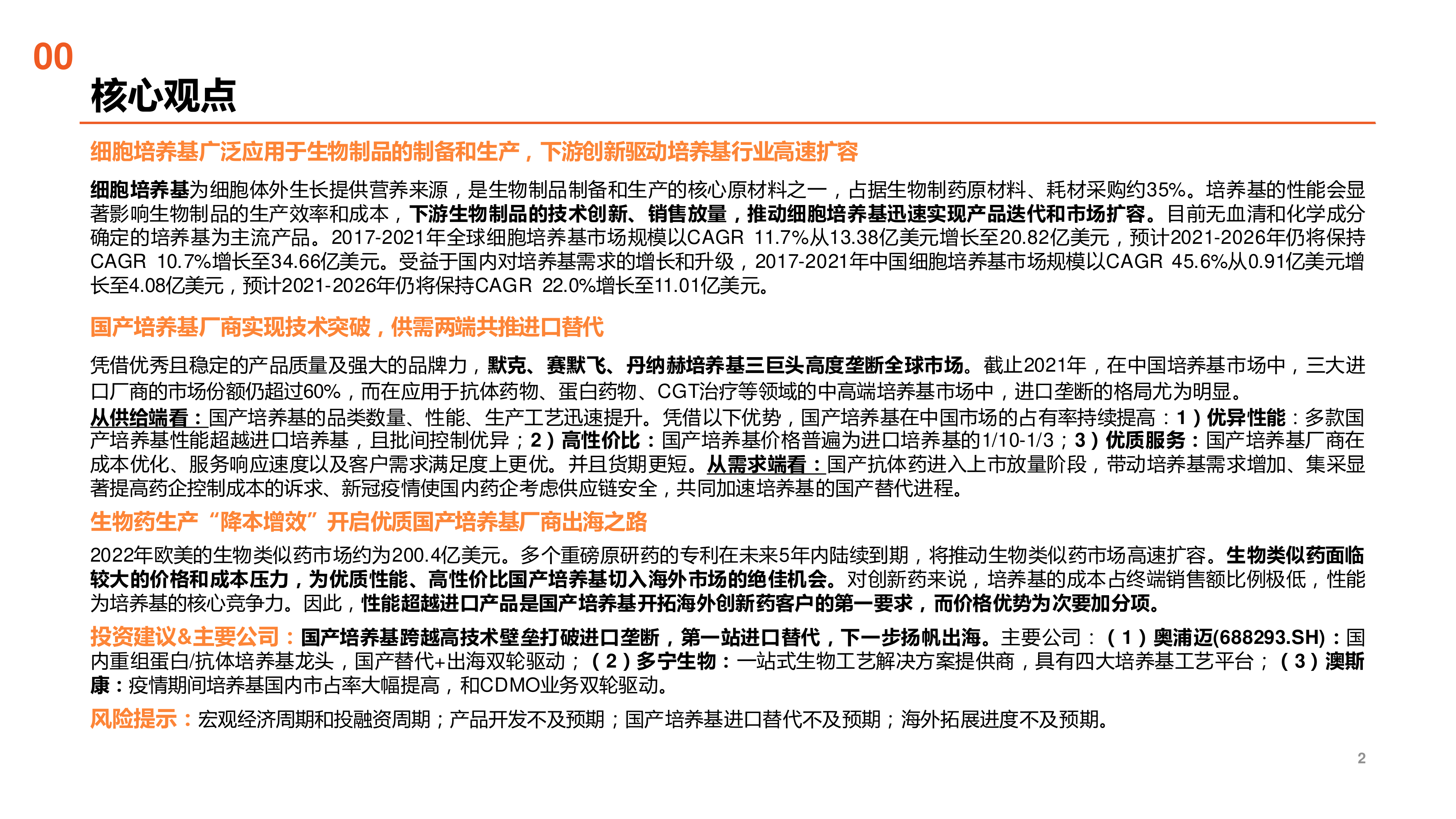 投资建议&主要公司:国产培养基跨越高技术壁垒打破进口垄断,第一站进口替代,下一步扬帆出海。主要公司:(1)奥浦迈(688293.SH):国内重组蛋白/抗体培养基龙头,国产替代+出海双轮驱动;(2)多宁生物:一站式生物工艺解决方案提供商,具有四大培养基工艺平台;(3)澳斯康:疫情期间培养基国内市占率大幅提高,和CDMO业务双轮驱动。