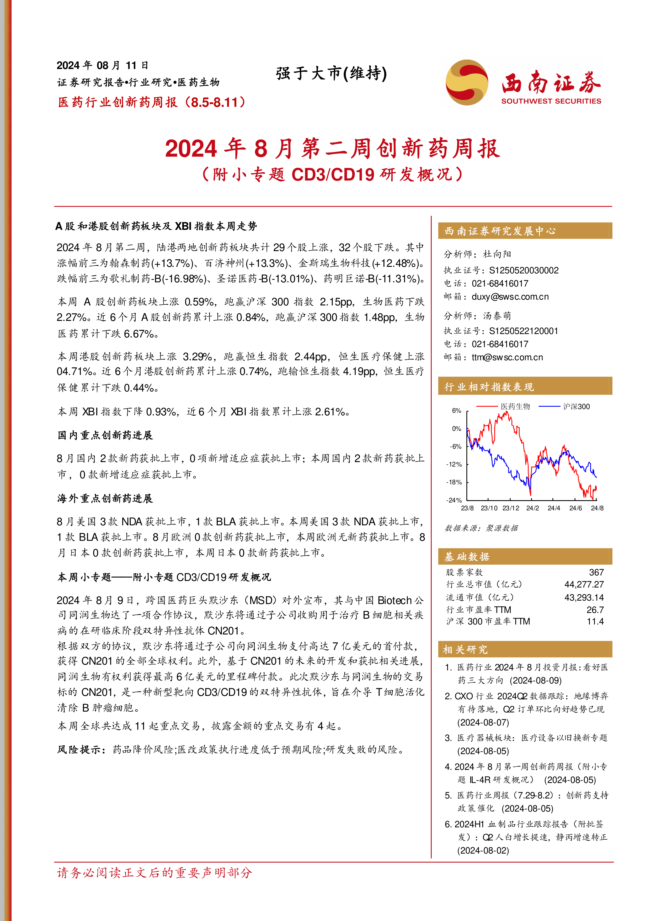 2024年8月第二周创新药周报(附小专题CD3/CD19研发概况)