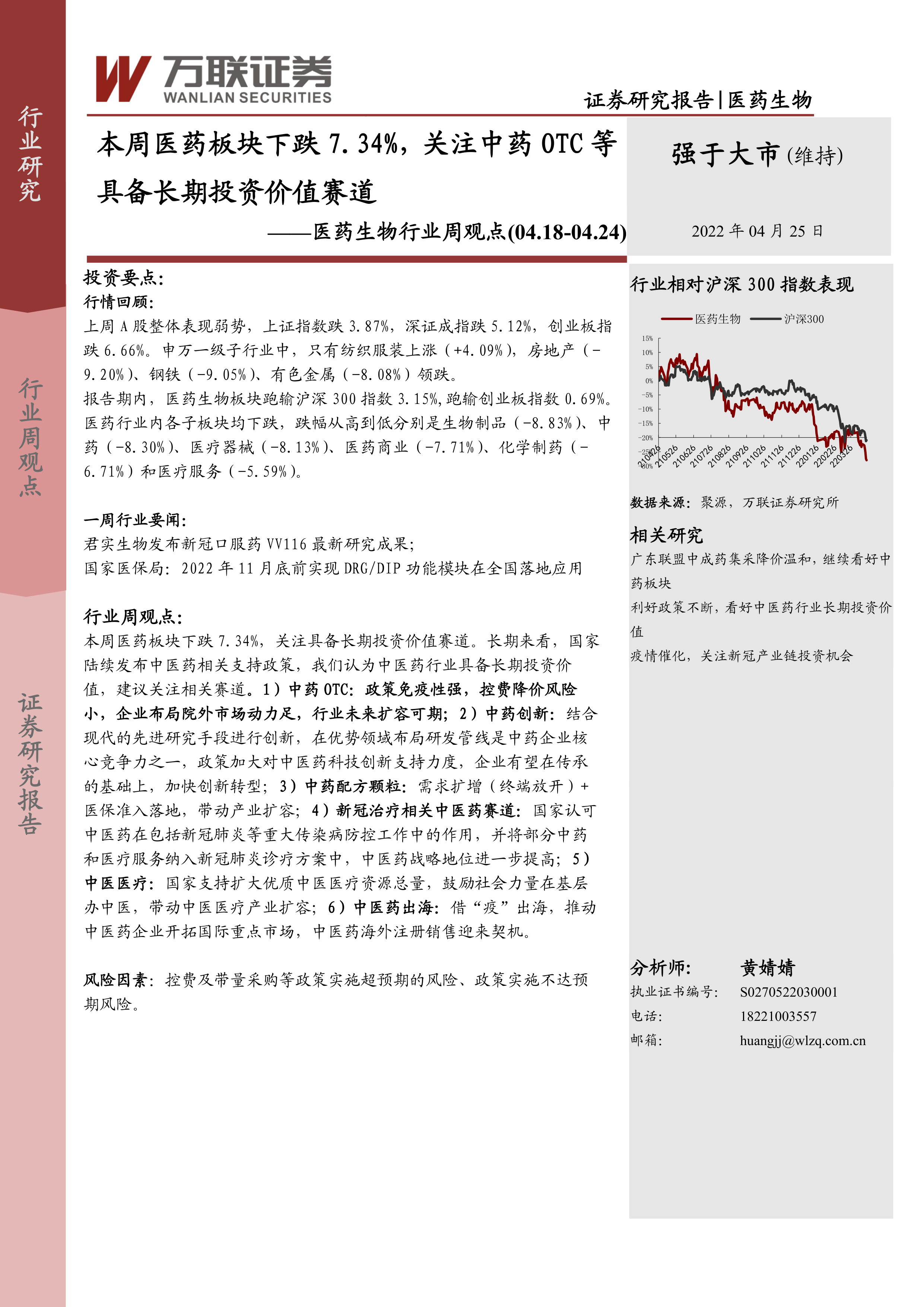 本周医药板块下跌7.34%,关注具备长期投资价值赛道。长期来看,国家陆续发布中医药相关支持政策,我们认为中医药行业具备长期投资价值,建议关注相关赛道。1)中药OTC:政策免疫性强,控费降价风险小,企业布局院外市场动力足,行业未来扩容可期;2)中药创新:结合现代的先进研究手段进行创新,在优势领域布局研发管线是中药企业核心竞争力之一,政策加大对中医药科技创新支持力度,企业有望在传承的基础上,加快创新转型;3)中药配方颗粒:需求扩增(终端放开)+医保准入落地,带动产业扩容;4)新冠治疗相关中医药赛道:国家认可中医药在包括新冠肺炎等重大传染病防控工作中的作用,并将部分中药和医疗服务纳入新冠肺炎诊疗方案中,中医药战略地位进一步提高;5)中医医疗:国家支持扩大优质中医医疗资源总量,鼓励社会力量在基层办中医,带动中医医疗产业扩容;6)中医药出海:借“疫”出海,推动中医药企业开拓国际重点市场,中医药海外注册销售迎来契机。