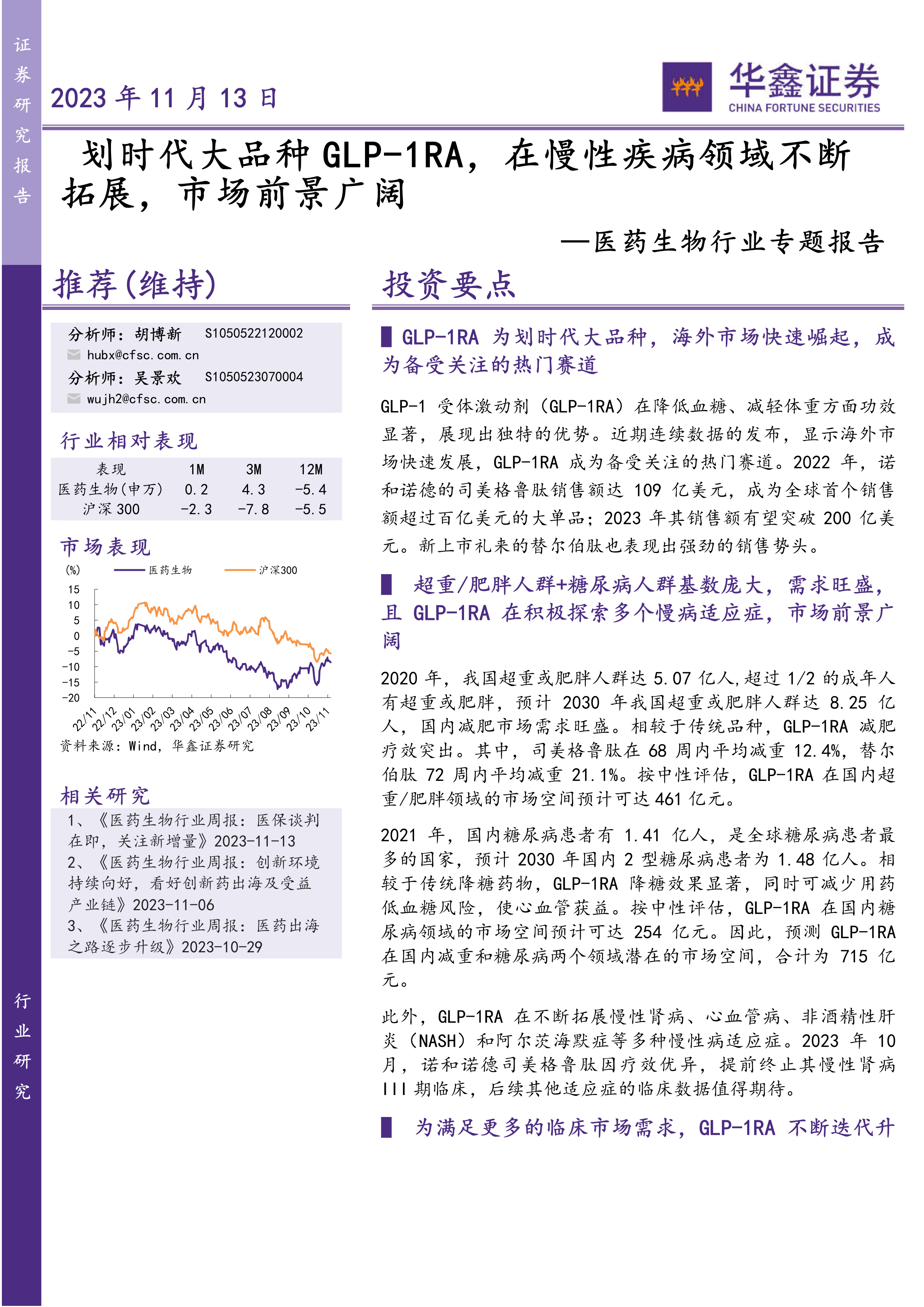 医药生物行业专题报告:划时代大品种GLP-1RA,在慢性疾病领域不断拓展,市场前景广阔