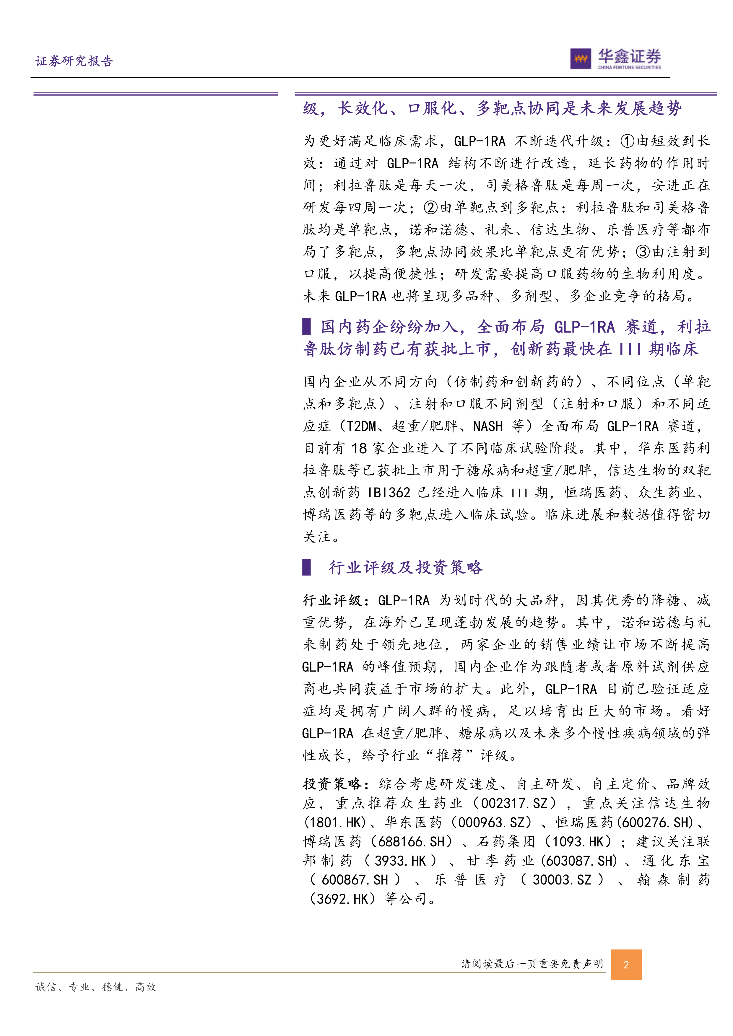 报告最后给出了行业评级和投资策略,重点推荐众生药业,并建议关注其他几家在 GLP-1RA 领域具有竞争优势的企业。