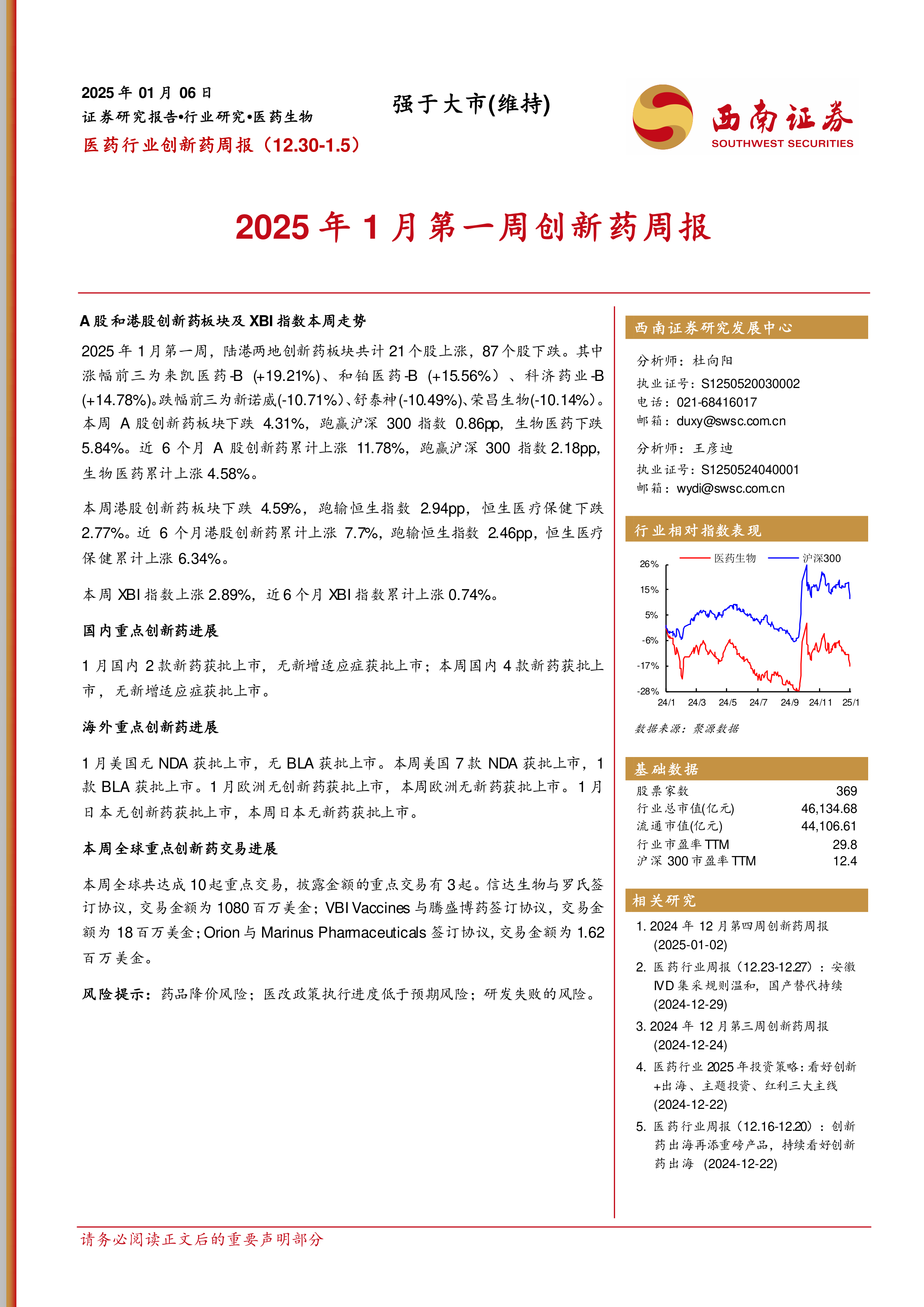 本报告对2025年1月第一周的创新药市场进行了全面分析,涵盖了陆港两地创新药板块的周度表现、国内外新药上市情况、国内外重点创新药进展、全球重点创新药交易进展以及GLP-1RA药物的研发和销售情况。 数据显示,A股创新药板块表现相对较好,全球创新药市场活跃,新药研发进展显著,但国内外新药上市数量差异较大。 报告为投资者提供了宝贵的市场信息和分析,有助于投资者更好地理解创新药市场动态,做出更明智的投资决策。 然而,报告也提示了药品降价、医改政策执行进度低于预期以及研发失败等风险。