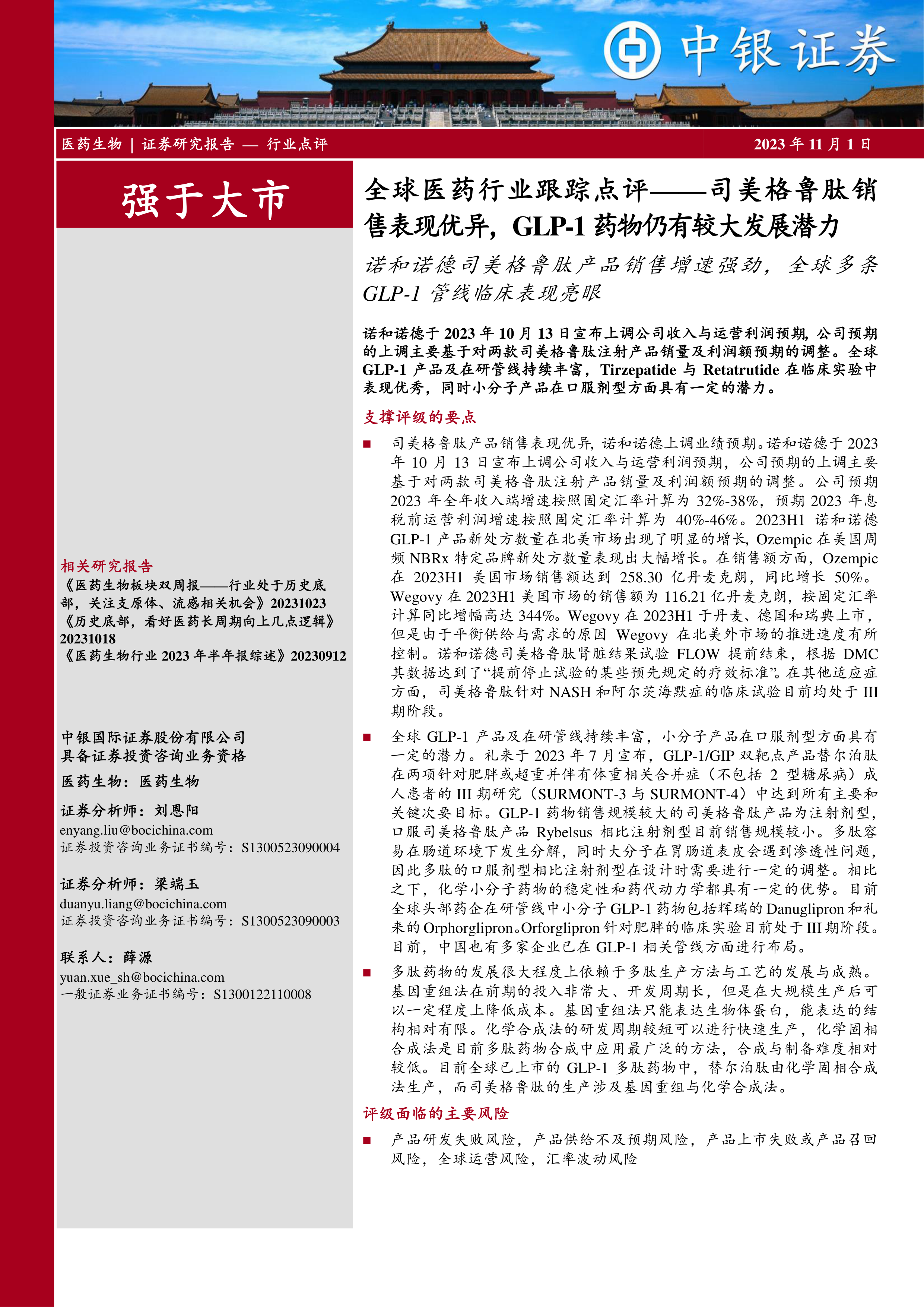 诺和诺德于2023年10月13日宣布上调公司收入与运营利润预期,公司预期的上调主要基于对两款司美格鲁肽注射产品销量及利润额预期的调整。全球GLP-1产品及在研管线持续丰富,Tirzepatide与Retatrutide在临床实验中表现优秀,同时小分子产品在口服剂型方面具有一定的潜力。