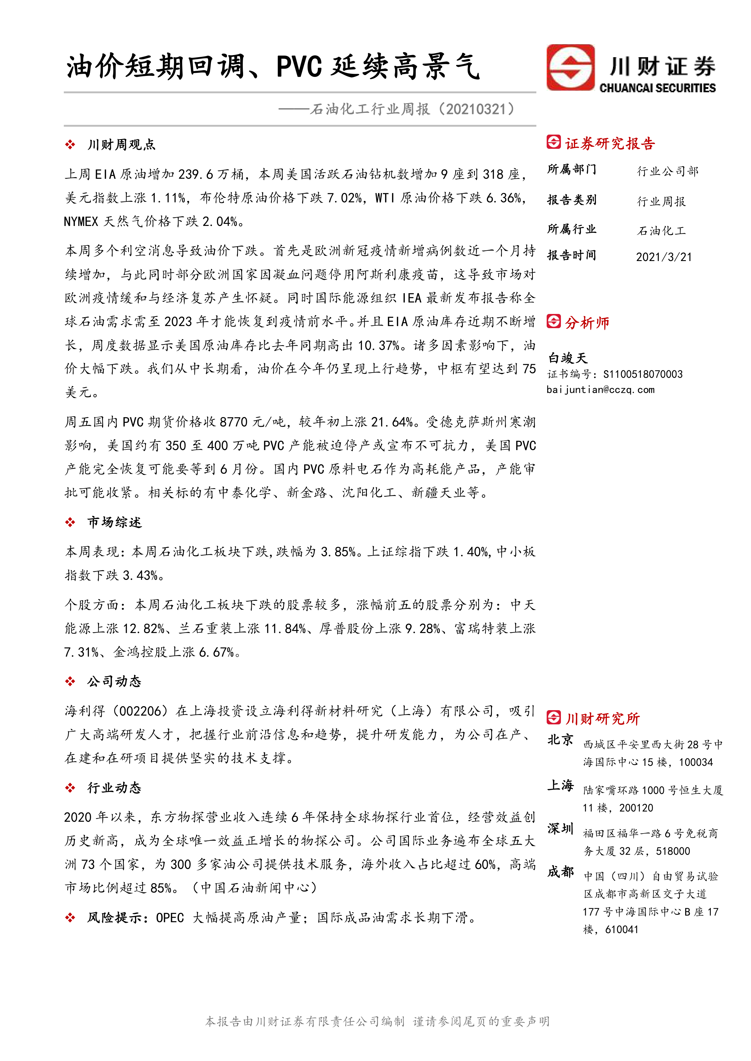 本报告分析了2021年3月21日当周石油化工行业的市场行情和行业动态。短期内,油价受多重利空因素影响出现回调,但长期来看,油价仍有上涨潜力。PVC市场则延续高景气,主要受供给端冲击影响。报告还总结了本周重要的行业动态和公司公告,为投资者提供参考信息。 需要注意的是,本报告仅供参考,不构成投资建议,投资者应根据自身情况进行独立判断。 未来油价和PVC价格走势仍存在不确定性,需持续关注相关因素变化。