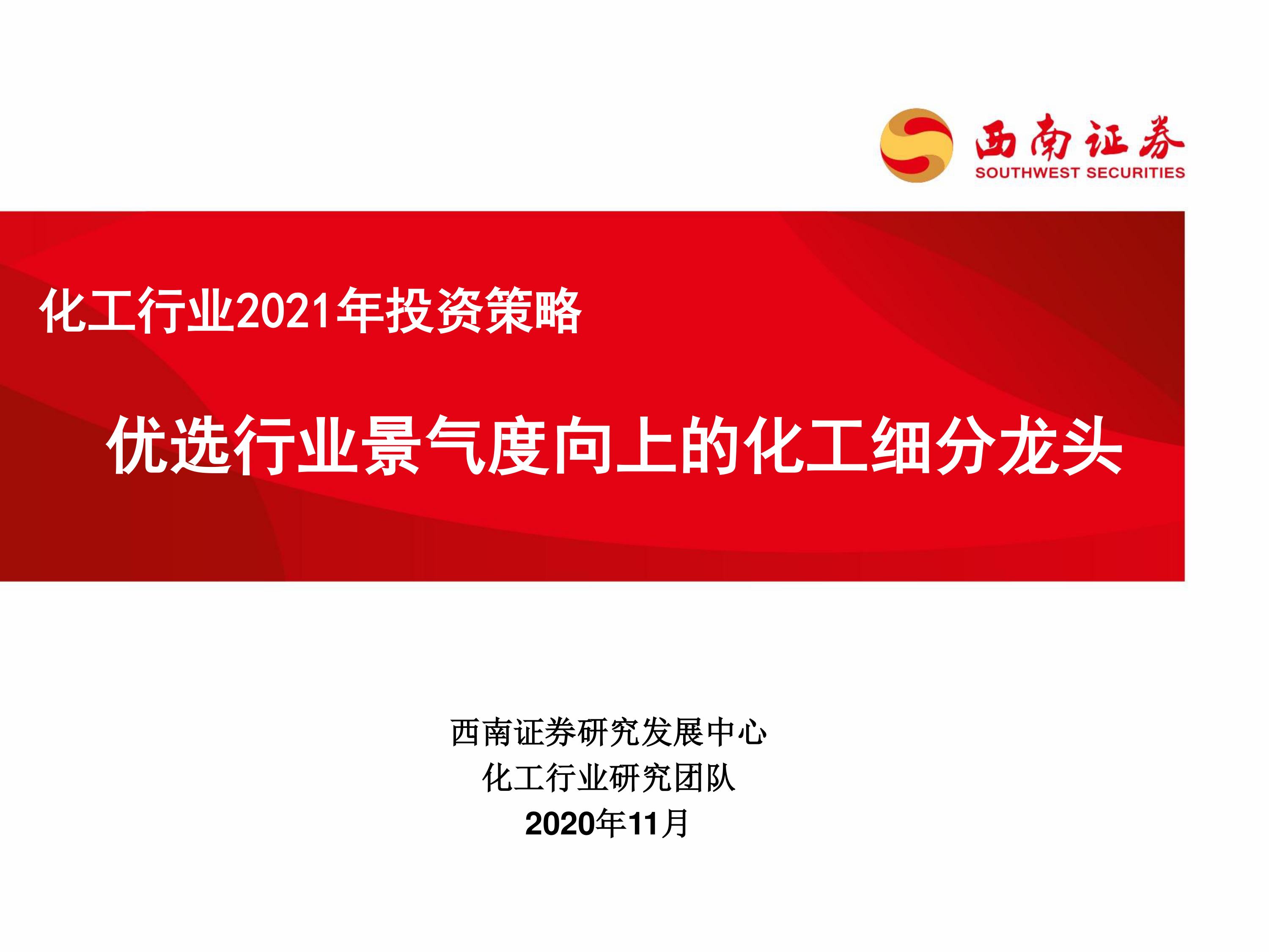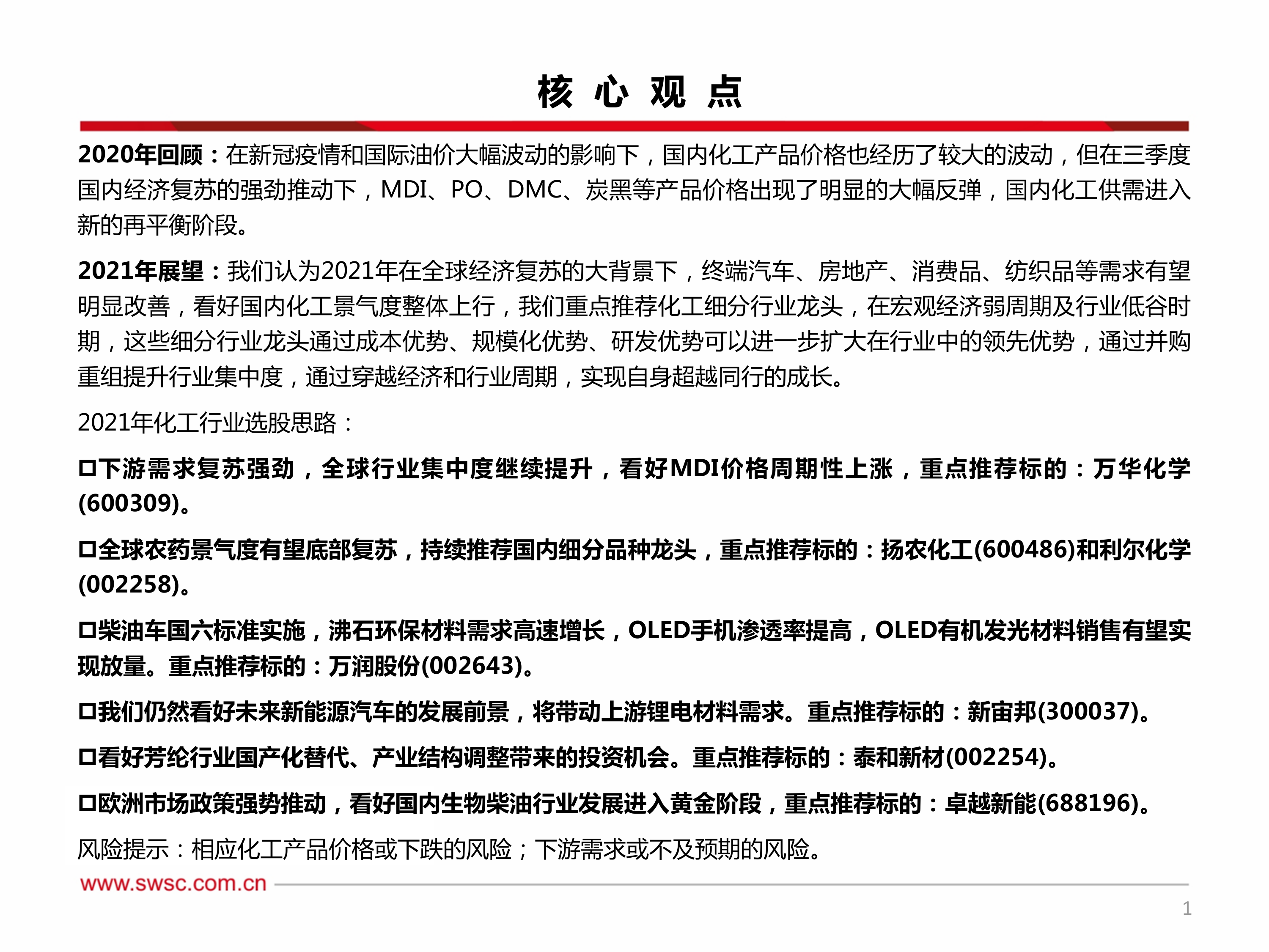 2021年展望:我们认为2021年在全球经济复苏的大背景下,终端汽车、房地产、消费品、纺织品等需求有望明显改善,看好国内化工景气度整体上行,我们重点推荐化工细分行业龙头,在宏观经济弱周期及行业低谷时期,这些细分行业龙头通过成本优势、规模化优势、研发优势可以进一步扩大在行业中的领先优势,通过并购重组提升行业集中度,通过穿越经济和行业周期,实现自身超越同行的成长。