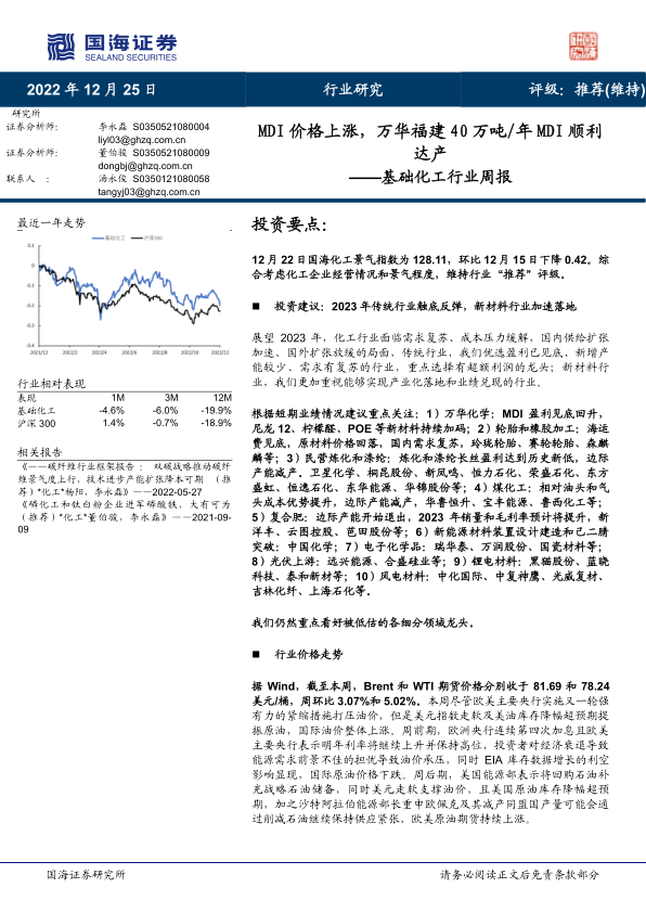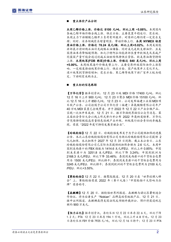 本报告的核心观点是:2022年12月25日,国海证券维持基础化工行业“推荐”评级。基于对化工企业经营状况和景气程度的综合考量,报告认为2023年传统化工行业将触底反弹,新材料行业将加速落地。报告重点关注MDI价格上涨、海运费见底以及部分化工产品盈利达到历史新低等市场现象,并对万华化学、玲珑轮胎、赛轮轮胎、森麒麟等重点公司进行了信息跟踪和盈利预测。