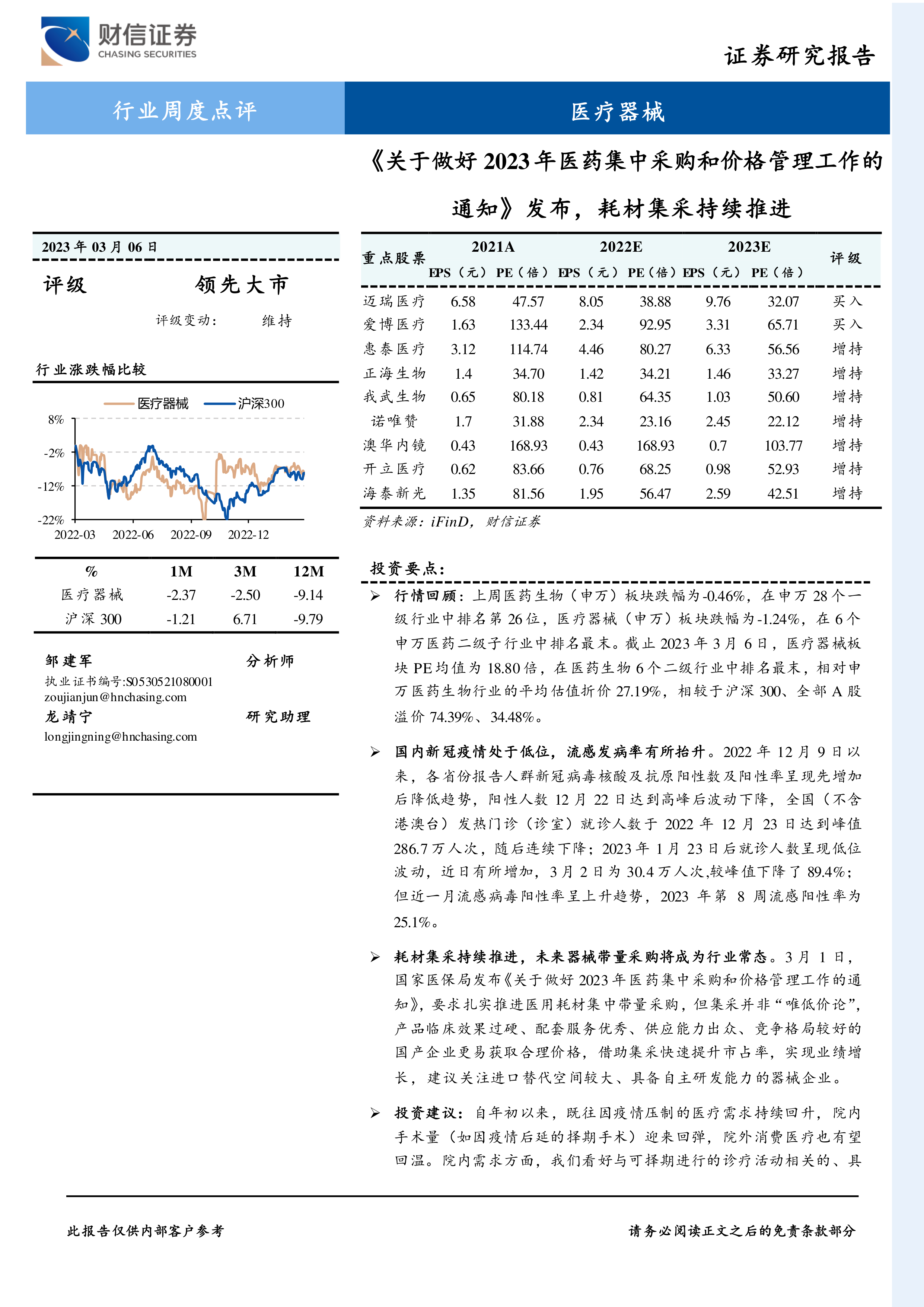 本报告对2023年3月6日一周医疗器械行业进行了全面分析。报告指出,耗材集采持续推进,将成为行业常态,但集采并非“唯低价论”,具备综合竞争力的国产企业将受益。同时,疫情后医疗需求回升,院内院外市场均有增长潜力。报告建议关注具备自主创新能力的医疗器械研发平台化厂家以及受益于集采和国产替代的创新型企业,并提示了海内外疫情加剧、集采政策变化等风险。 报告还提供了多家医疗器械公司的近期动态,为投资者提供参考。
