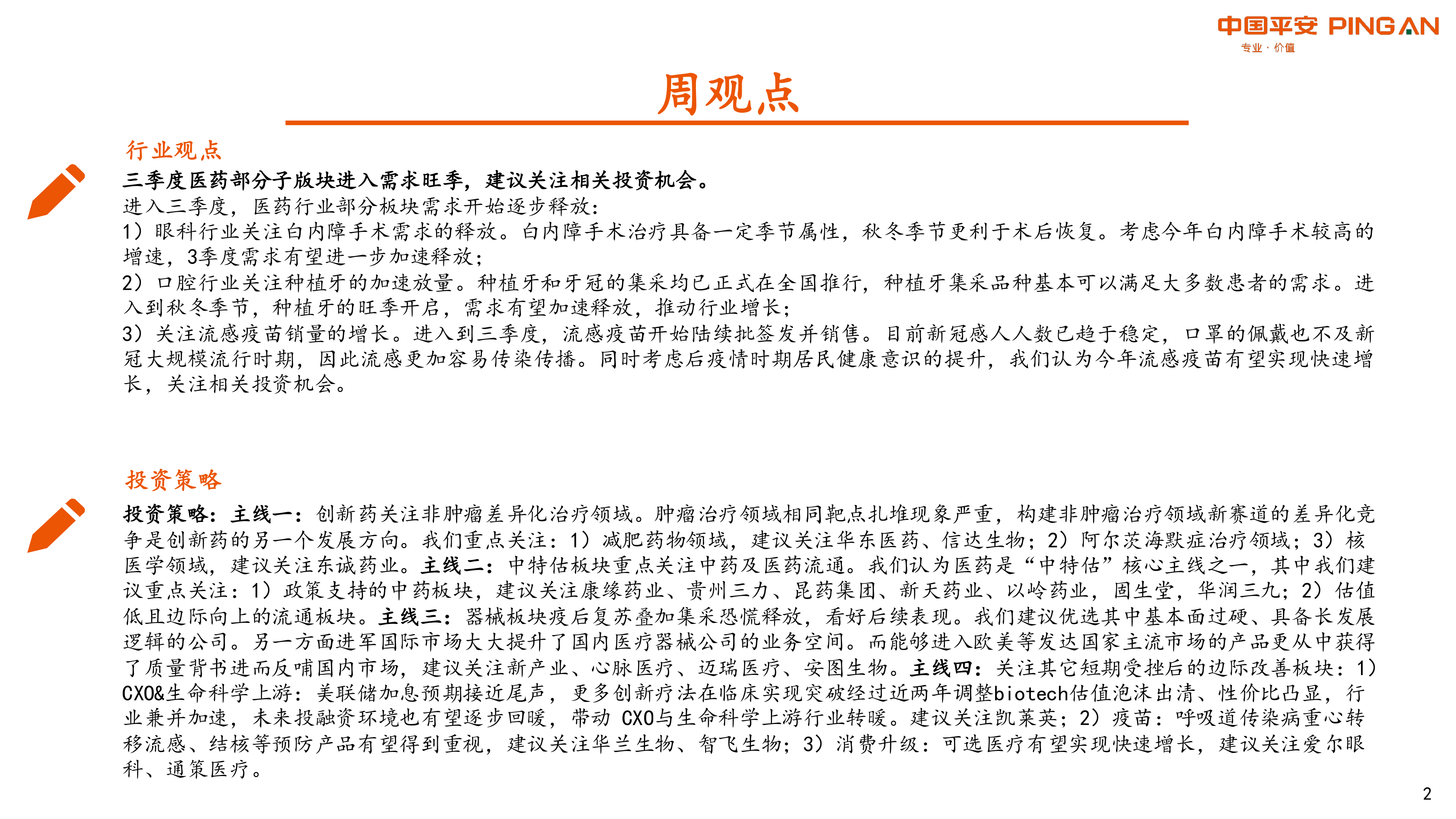 本报告的核心观点是:三季度部分医药子板块进入需求旺季,投资机会值得关注。报告基于对眼科、口腔、流感疫苗等细分领域的分析,以及对创新药、中特估、医疗器械等板块的投资策略建议,指出医药行业在三季度及未来一段时间内存在显著的投资机会。 具体而言,报告建议关注以下几个投资方向: