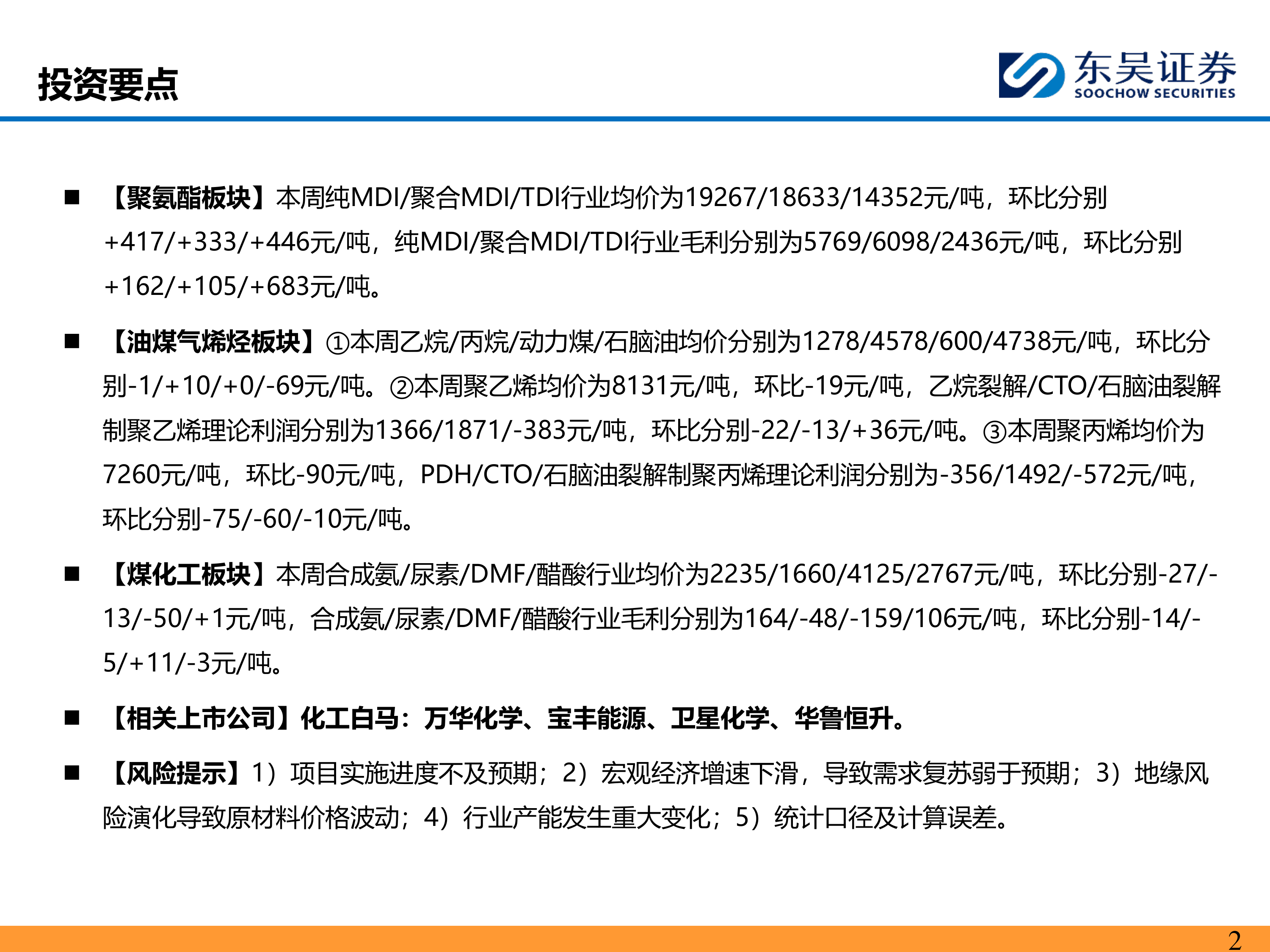 本报告的核心观点是:本周基础化工行业,特别是聚氨酯板块价格持续上涨,盈利能力增强;而油煤气烯烃板块和煤化工板块则呈现出不同的价格和盈利走势。报告通过对关键产品价格、毛利率以及相关上市公司表现的分析,揭示了基础化工行业当前的市场动态和潜在风险。
