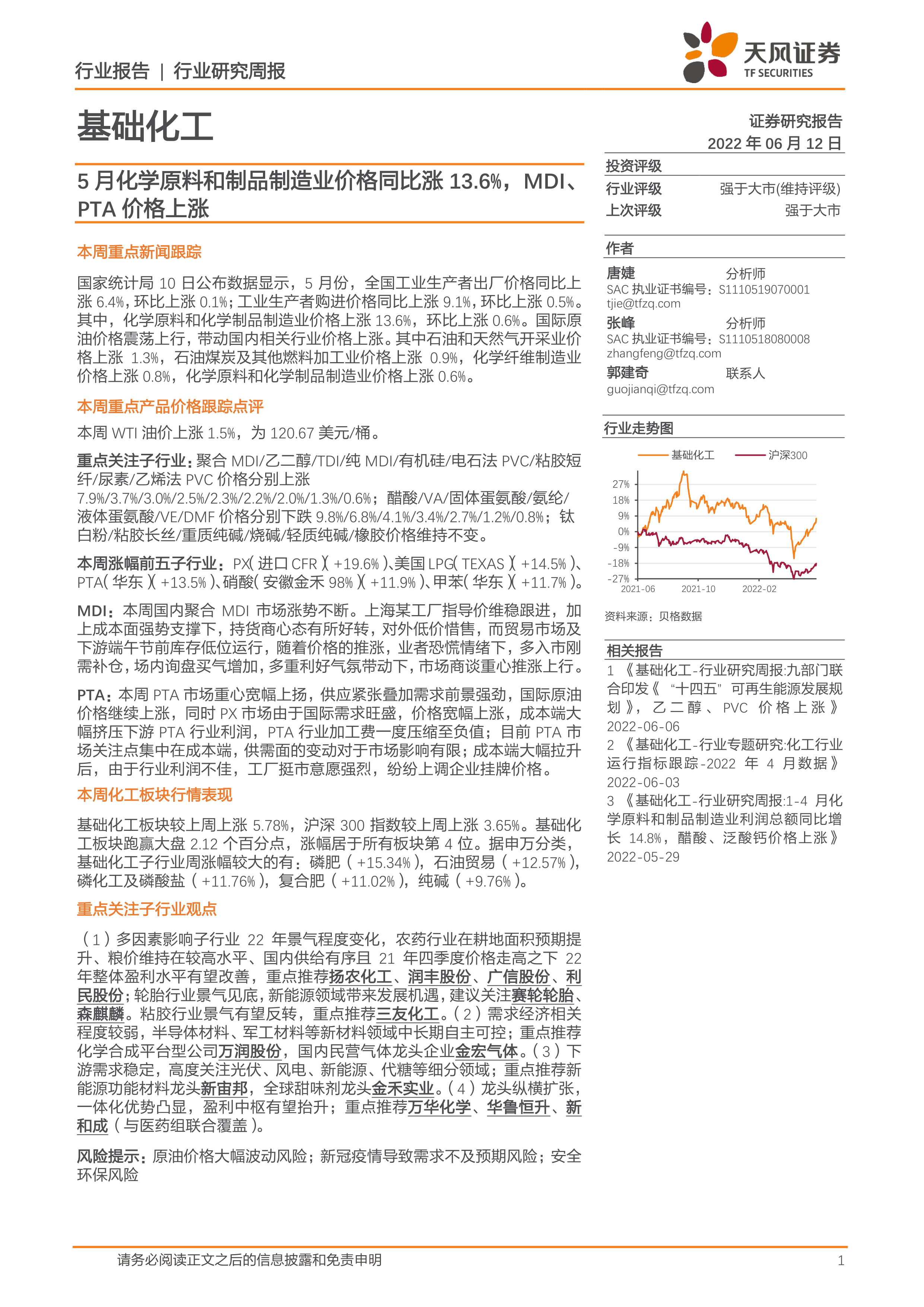 基础化工行业研究周报:5月化学原料和制品制造业价格同比涨13.6%,MDI、PTA价格上涨
