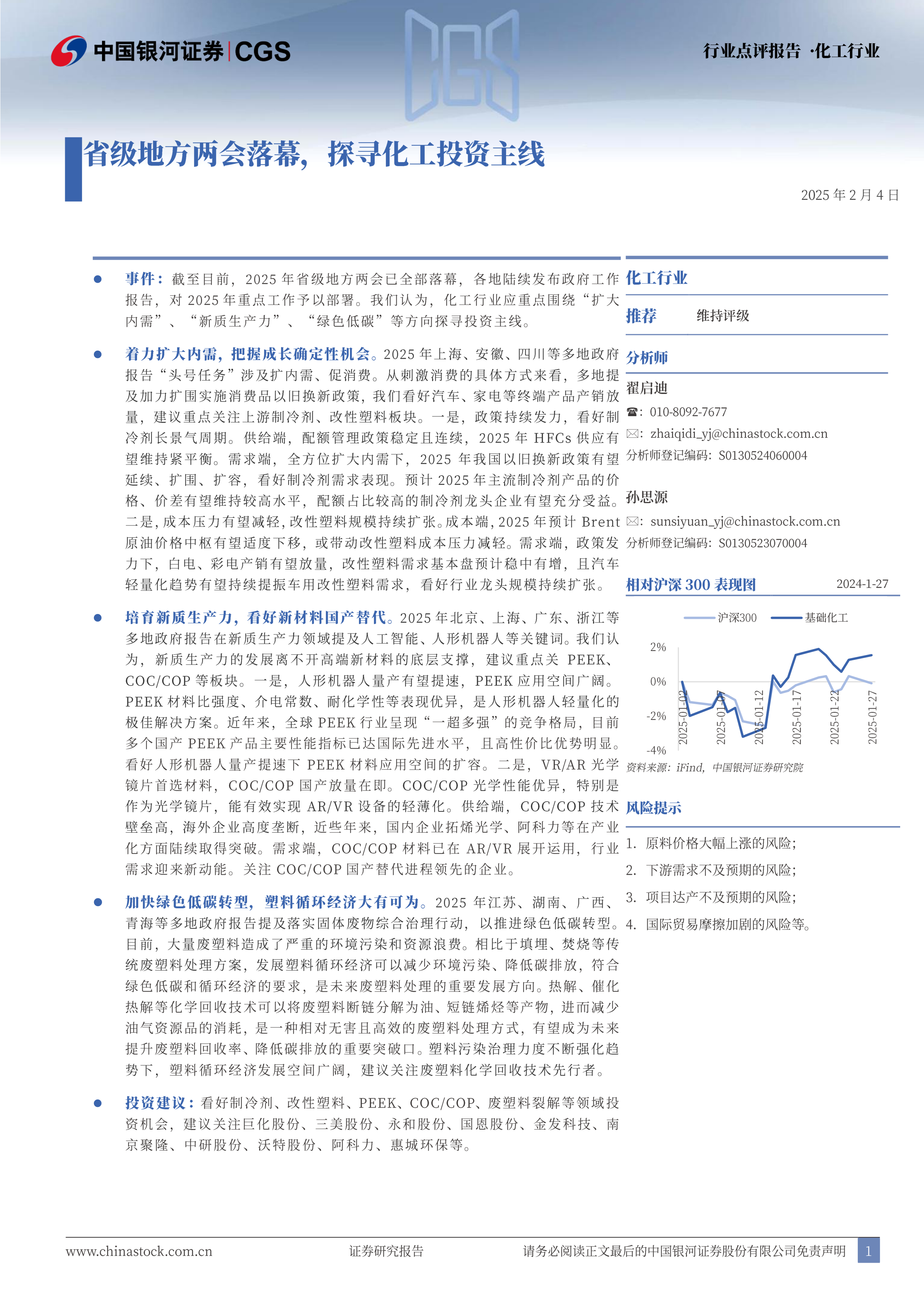 投资建议:看好制冷剂、改性塑料、PEEK、COC/COP、废塑料裂解等领域投资机会,建议关注巨化股份、三美股份、永和股份、国恩股份、金发科技、南京聚隆、中研股份、沃特股份、阿科力、惠城环保等。