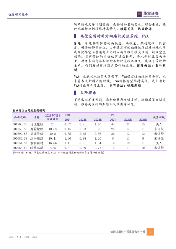 本报告基于2022年上半年化工行业数据,分析了行业整体景气度、各子板块盈利能力分化以及库存情况。报告认为,2022年下半年化工行业仍将维持高景气度,并建议投资者关注景气复苏品种(轮胎、纯碱)和国产替代机遇(芳纶、PVA)。报告还对六家公司进行了详细的投资分析,并提示了潜在的投资风险。 报告数据主要来源于Wind和华鑫证券研究,但需注意报告中盈利预测部分,部分公司数据来自万得一致预期,并非华鑫证券自身预测。 投资者需结合自身情况,谨慎决策。