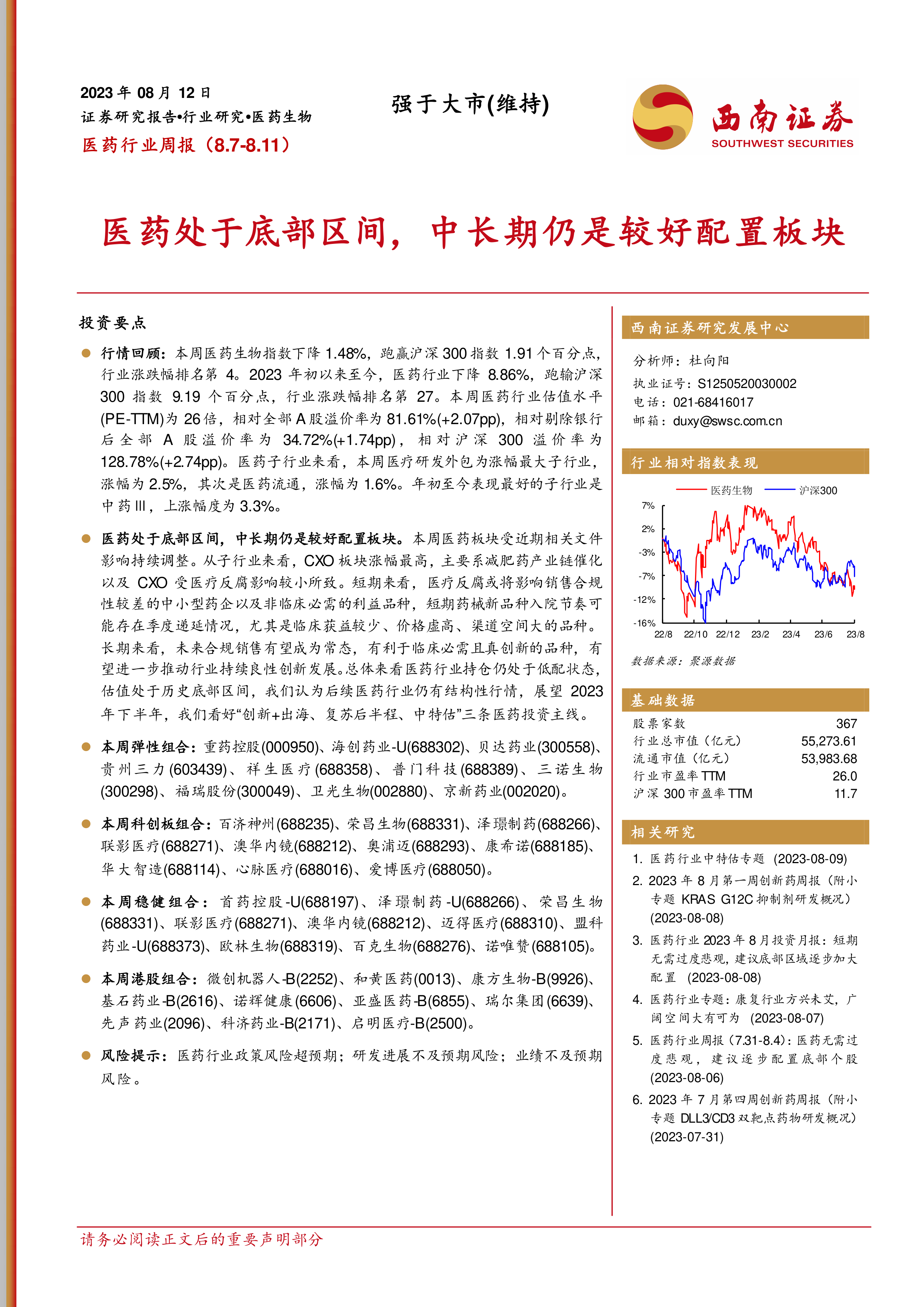 本报告对医药行业近期表现进行了全面分析,指出行业目前处于底部区间,并对未来走势持乐观态度。报告建议投资者关注“创新+出海、复苏后半程、中特估”三条投资主线,并提供了相应的投资组合建议和个股分析。 报告数据翔实,分析深入,为投资者提供了有价值的参考信息。 然而,投资者仍需注意报告中提到的风险提示,并结合自身情况进行独立判断。