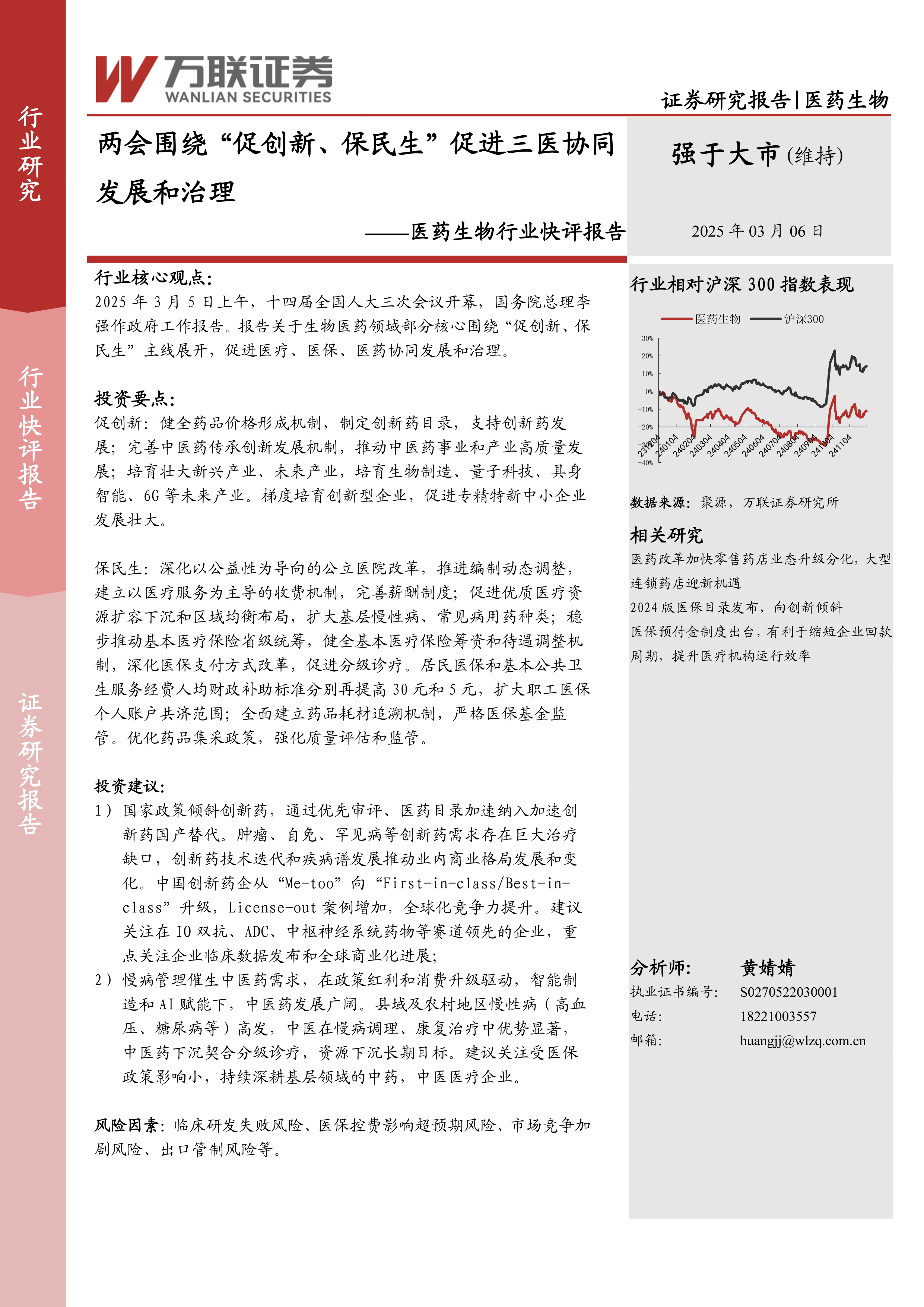 本报告基于十四届全国人大三次会议政府工作报告,对医药生物行业进行了分析。报告认为,“促创新、保民生”的主线将驱动创新药和中医药产业发展。报告建议投资者关注创新药和中医药领域的投资机会,同时需注意潜在的风险因素。 报告以数据图表(虽然报告中未提供具体数据,但提及了沪深300指数与医药生物行业指数的对比)辅助分析,并提供了专业的投资建议。 然而,报告缺乏具体的公司名称和数据支持,这限制了其分析的深度和说服力。 未来报告可以补充更详尽的数据和案例分析,以增强其可信度和实用性。