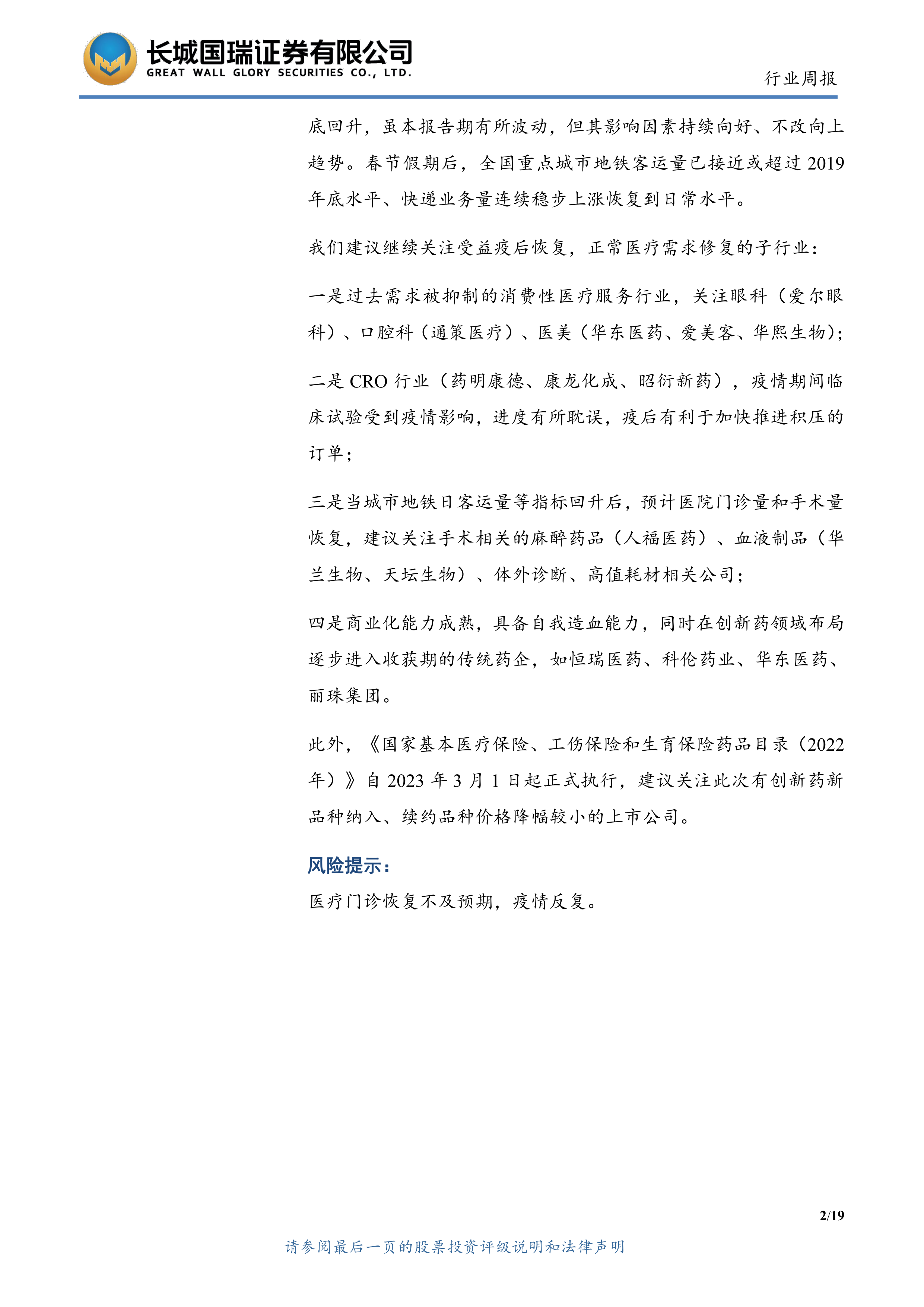报告认为,疫情管控政策的调整和经济复苏将持续利好医药行业。因此,建议投资者关注以下几个受益于疫后恢复和正常医疗需求修复的子行业: