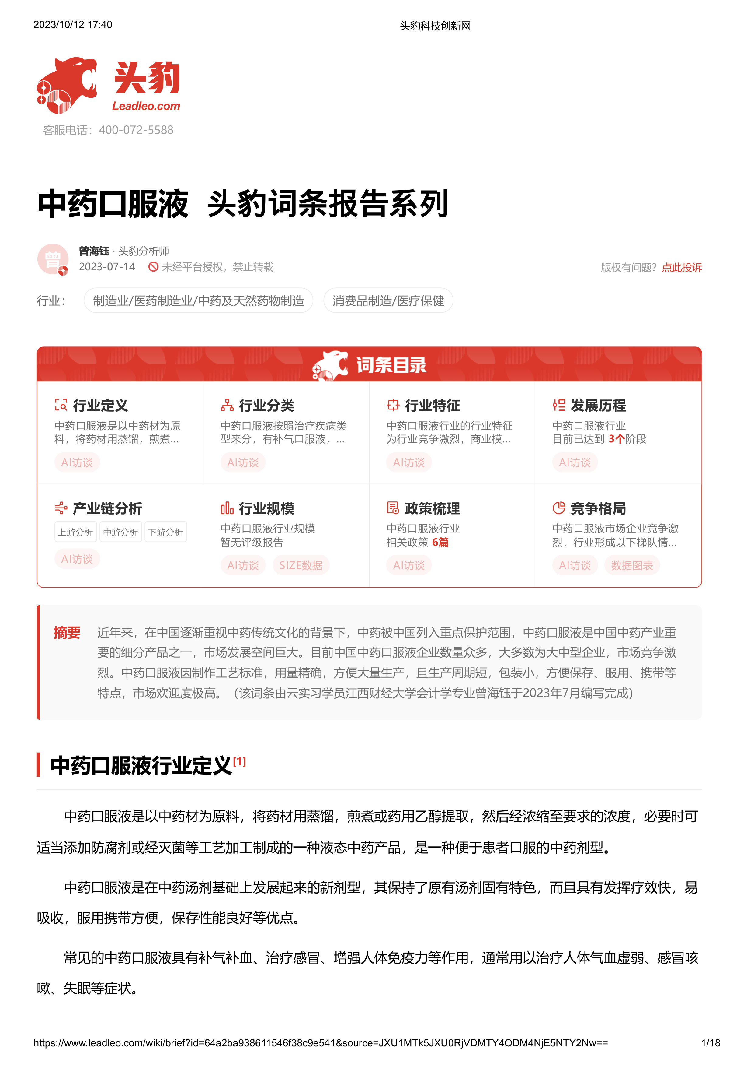 中药口服液 头豹词条报告系列