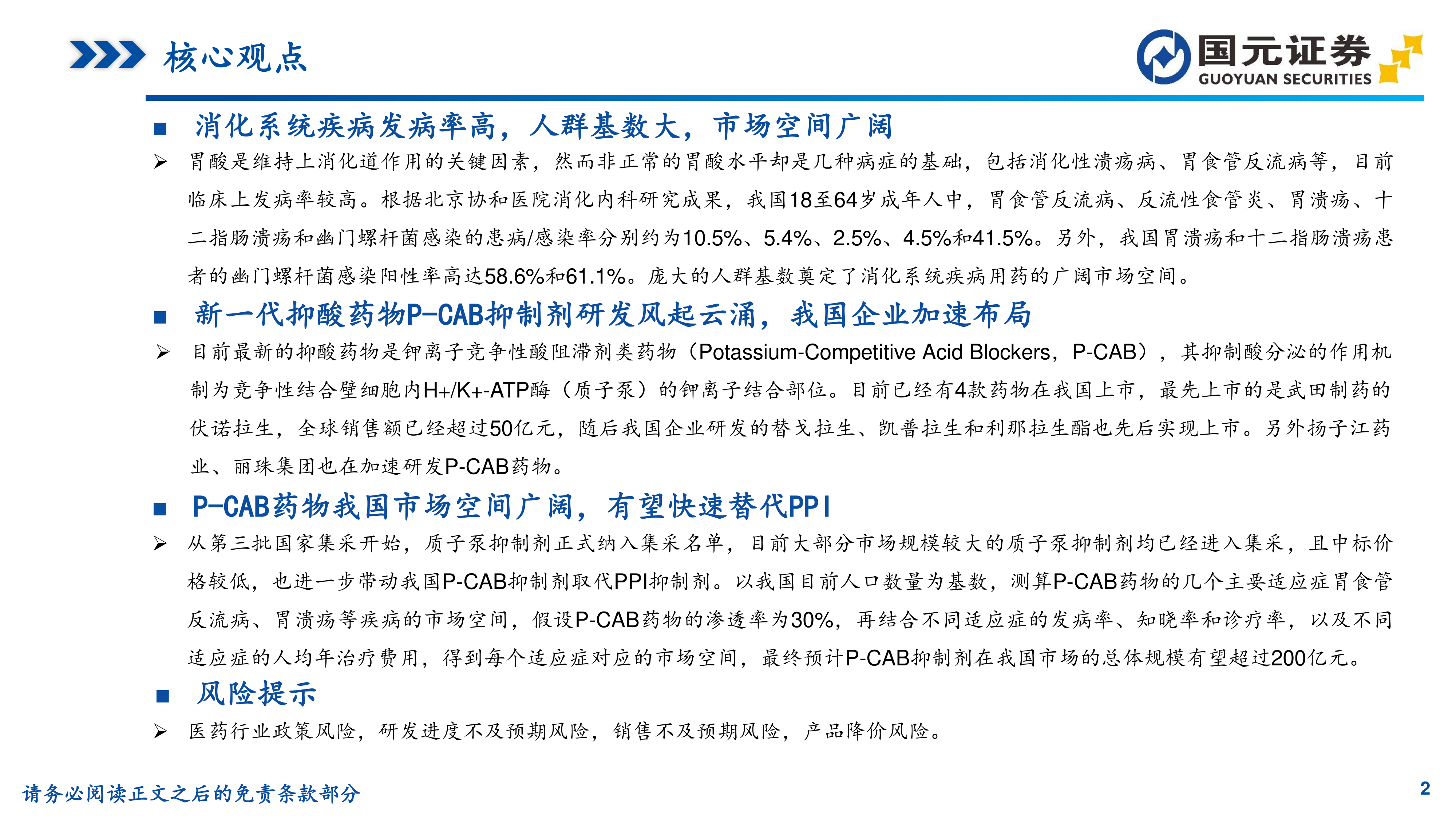 本报告的核心观点是:消化系统疾病在中国具有高发病率和庞大的人群基数,为抑酸药物市场提供了广阔的空间。新一代抑酸药物P-CAB抑制剂凭借其优越的作用机制和疗效,有望快速替代传统的PPI抑制剂,并在中国市场占据主导地位,市场规模有望超过200亿元。然而,医药行业政策风险、研发进度不及预期、销售不及预期以及产品降价风险等因素也需关注。