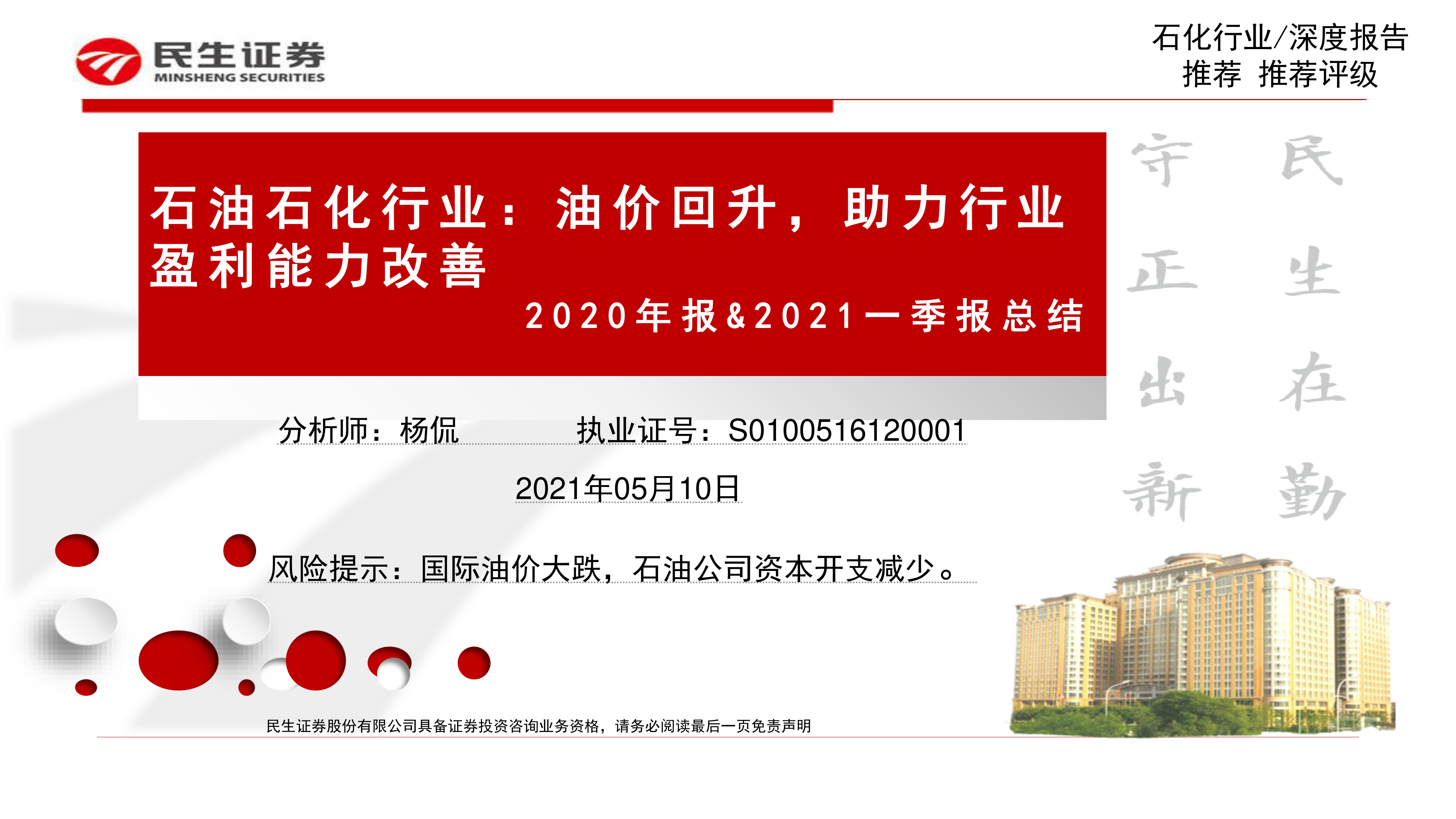 本报告基于民生证券对石油石化行业的深度研究,利用2020年年报和2021年一季报数据,对行业整体及细分板块(石油开采、石油化工、油服工程)的业绩进行分析,并对未来油价走势及投资机会进行展望。核心观点如下: