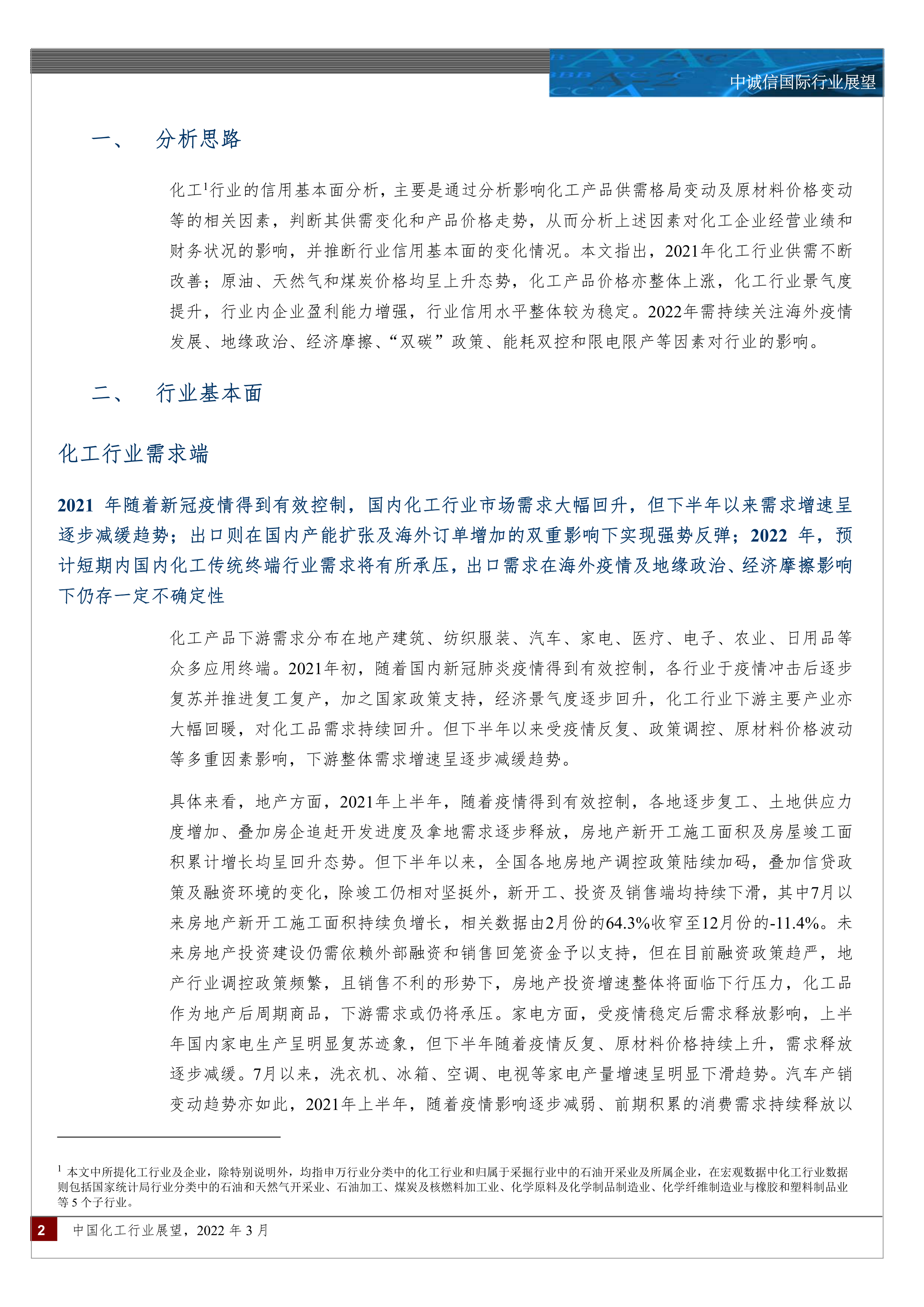 “双碳”政策、能耗双控以及限电限产等政策是影响行业生产的重要因素;2022年,预计短期内国内化工传统终端行业需求将有不同程度承压,出口需求在海外疫情及地缘政治、经济摩擦影响下仍存一定不确定性;