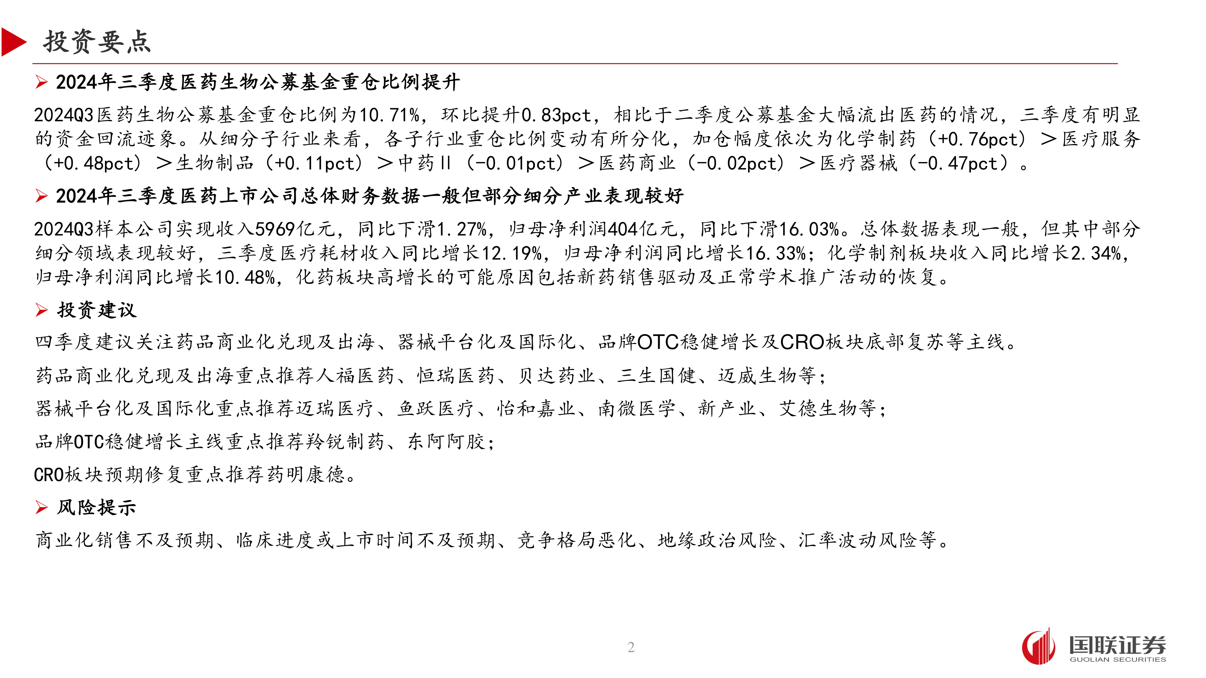 2024年三季度中国医药市场呈现出复杂局面,整体业绩下滑,但部分细分领域表现亮眼,资金回流迹象明显。行业面临挑战与机遇并存,集采降价、合规整顿等政策对部分领域造成短期压力,但老龄化趋势、政策支持中医药发展以及创新药的持续研发等因素为行业长期发展带来机遇。投资者应关注不同细分领域的差异化表现,并结合公司基本面和行业趋势进行投资决策。报告中提到的重点个股分析为投资者提供了有价值的参考信息,但投资者仍需进行独立判断,并承担相应的投资风险。 未来,药品商业化兑现及出海、器械平台化及国际化、品牌OTC稳健增长及CRO板块底部复苏将是重要的投资主线。