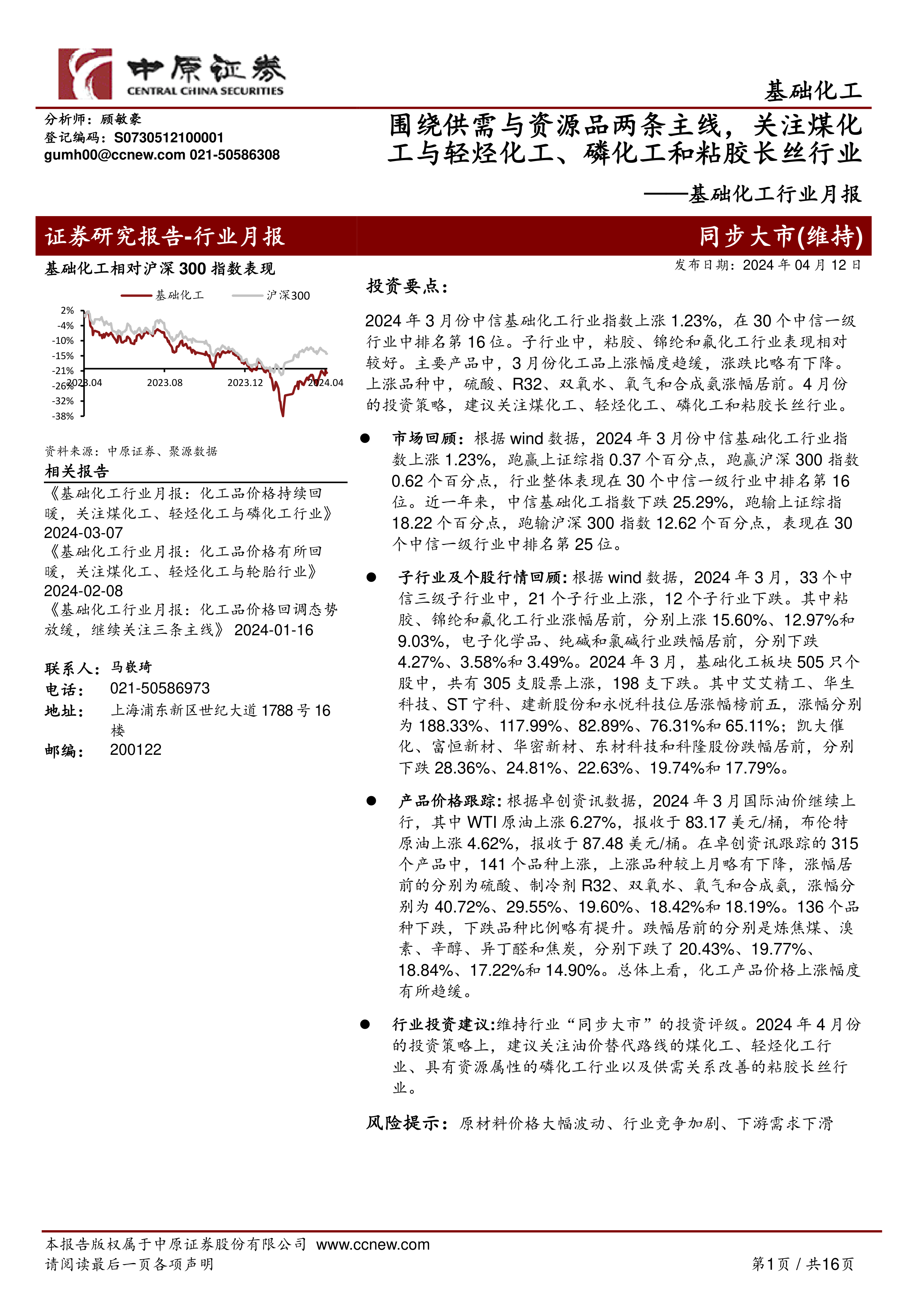 行业投资建议:维持行业“同步大市”的投资评级。2024年4月份的投资策略上,建议关注油价替代路线的煤化工、轻烃化工行业、具有资源属性的磷化工行业以及供需关系改善的粘胶长丝行业。