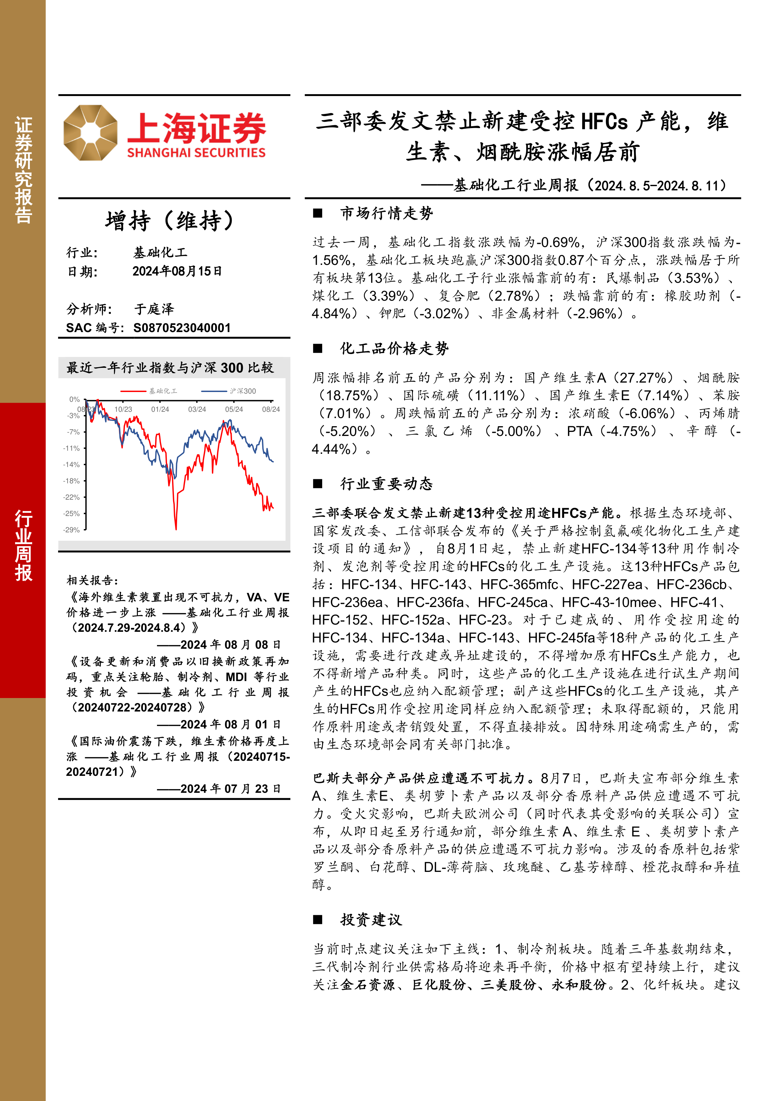 基础化工行业周报:三部委发文禁止新建受控HFCs产能,维生素、烟酰胺涨幅居前