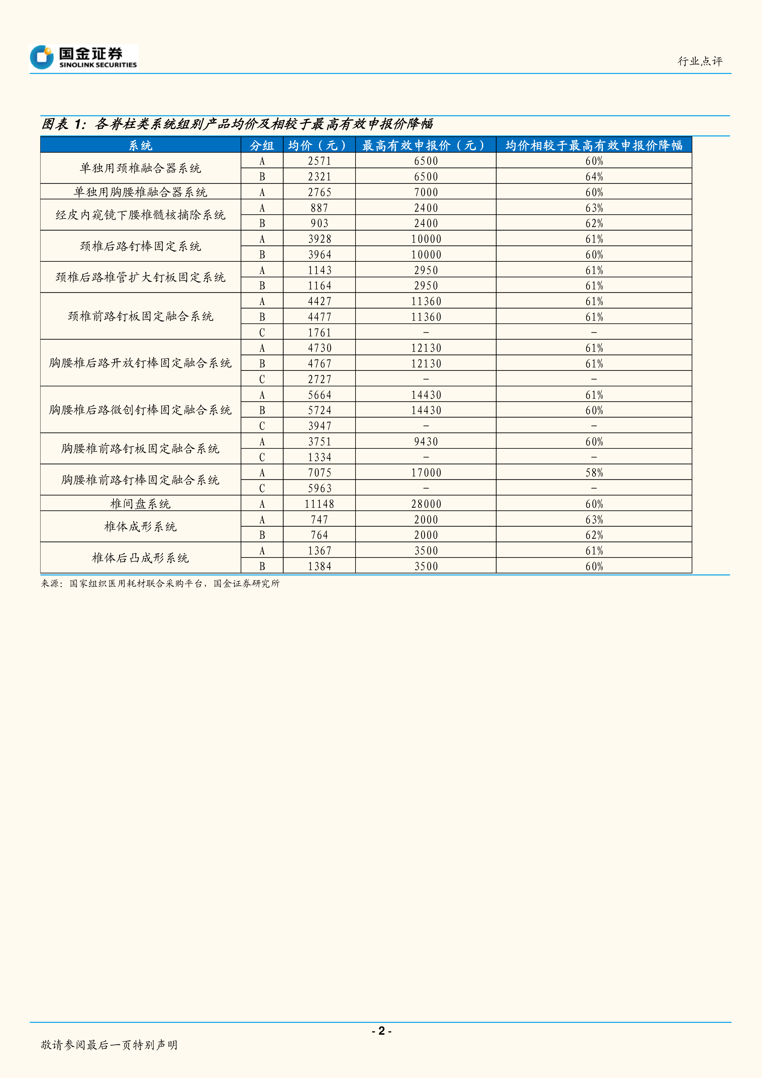 本报告分析了2022年9月27日公布的国家组织骨科脊柱类耗材集中带量采购拟中选结果。结果显示,国产企业中标情况良好,市场份额有望提升,脊柱手术渗透率有望进一步提高。虽然集采导致价格下降,但行业集中度将进一步提升,国产龙头企业仍有望保持合理的利润空间。报告建议关注具有核心竞争力的企业,并提示了潜在的市场风险。 图表1详细列出了各脊柱类系统组别产品的均价及降幅,为投资者提供了数据支持。 总而言之,此次集采对骨科脊柱类耗材行业的影响是深远的,既带来了挑战,也带来了机遇。 国产企业需要抓住机遇,提升自身竞争力,才能在未来的市场竞争中立于不败之地。
