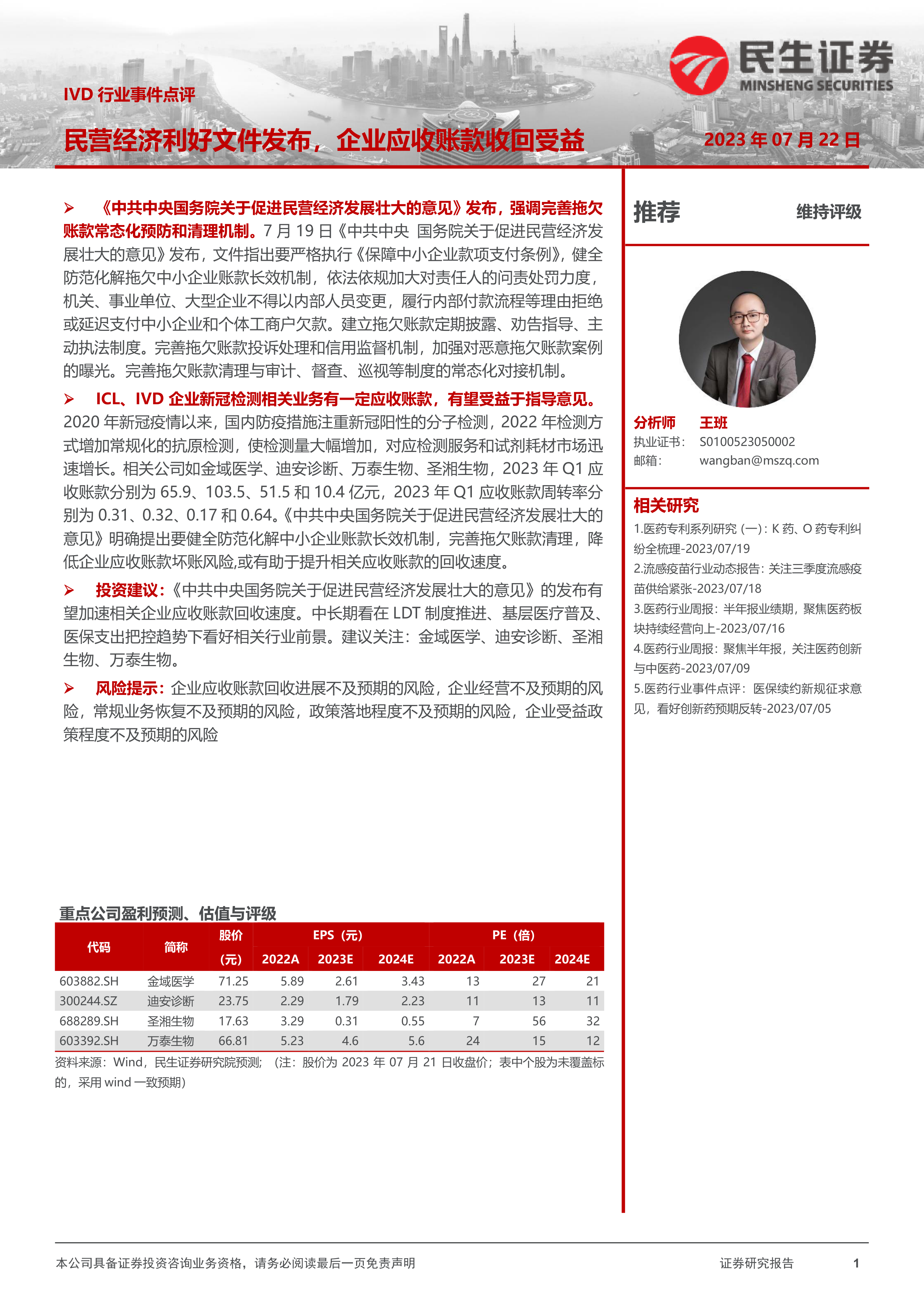 本报告主要围绕《中共中央国务院关于促进民营经济发展壮大的意见》对IVD行业的影响展开分析。