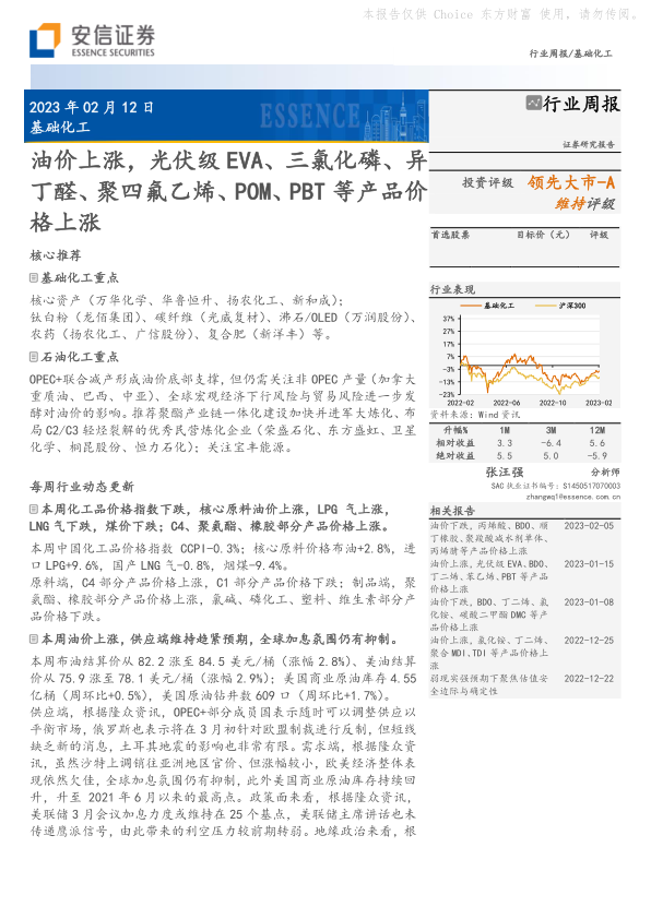 基础化工行业周报:油价上涨,光伏级EVA、三氯化磷、异丁醛、聚四氟乙烯、POM、PBT等产品价格上涨