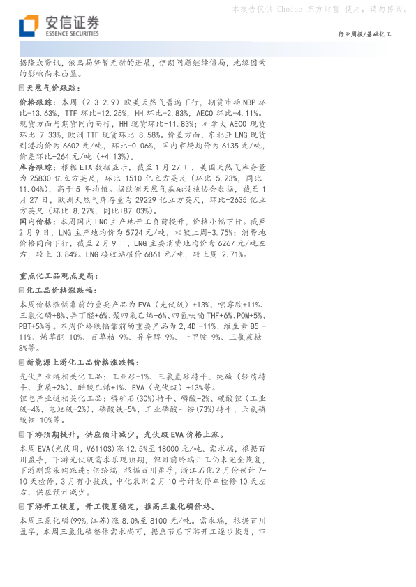 本报告的核心观点是:近期油价上涨,带动部分基础化工产品价格上涨,例如光伏级EVA、三氯化磷、异丁醛、聚四氟乙烯、POM、PBT等。但整体化工品价格指数下跌,部分产品价格下跌,例如2,4D、维生素B5、烯草酮等。 市场受多种因素影响,包括原料价格波动、下游需求变化、供应端变化以及宏观经济环境等。 报告建议关注聚酯产业链一体化建设加快并进军大炼化的优秀民营炼化企业,以及新能源上游化工品市场。