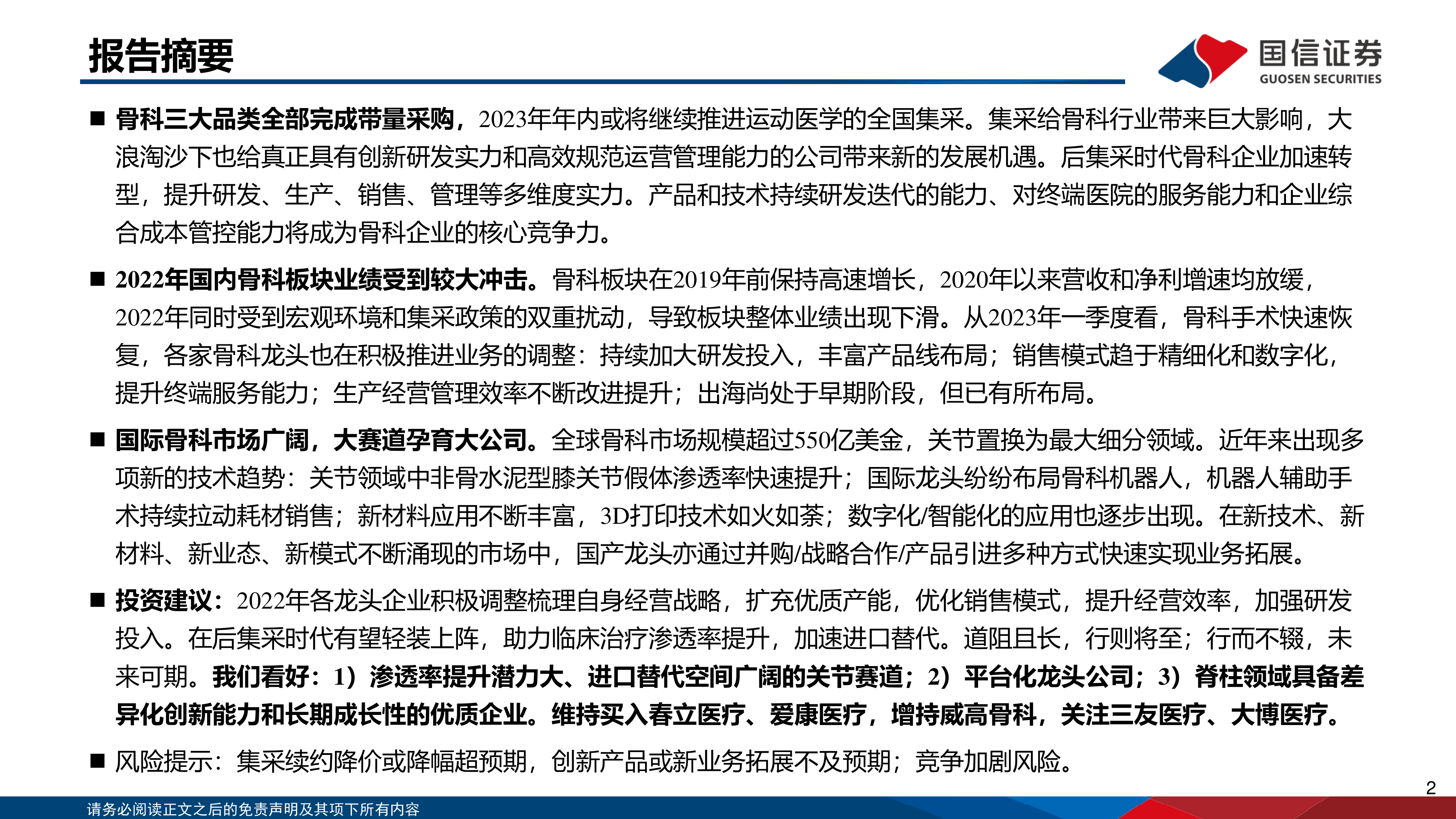 本报告的核心观点是:2022年国内骨科板块业绩受集采政策和宏观环境双重冲击下滑,但2023年一季度骨科手术快速恢复,龙头企业积极调整战略,加大研发投入,优化销售模式,提升经营效率,在后集采时代有望轻装上阵,加速进口替代。报告看好渗透率提升潜力大、进口替代空间广阔的关节赛道,平台化龙头公司,以及脊柱领域具备差异化创新能力和长期成长性的优质企业。