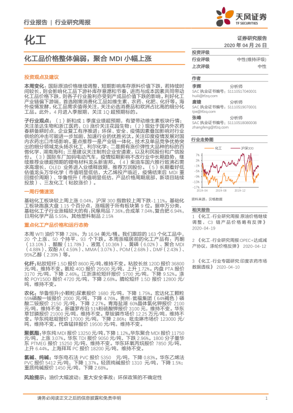 报告维持化工行业评级为中性。考虑到国际原油价格波动和疫情影响,报告建议投资者关注以下几个方面: