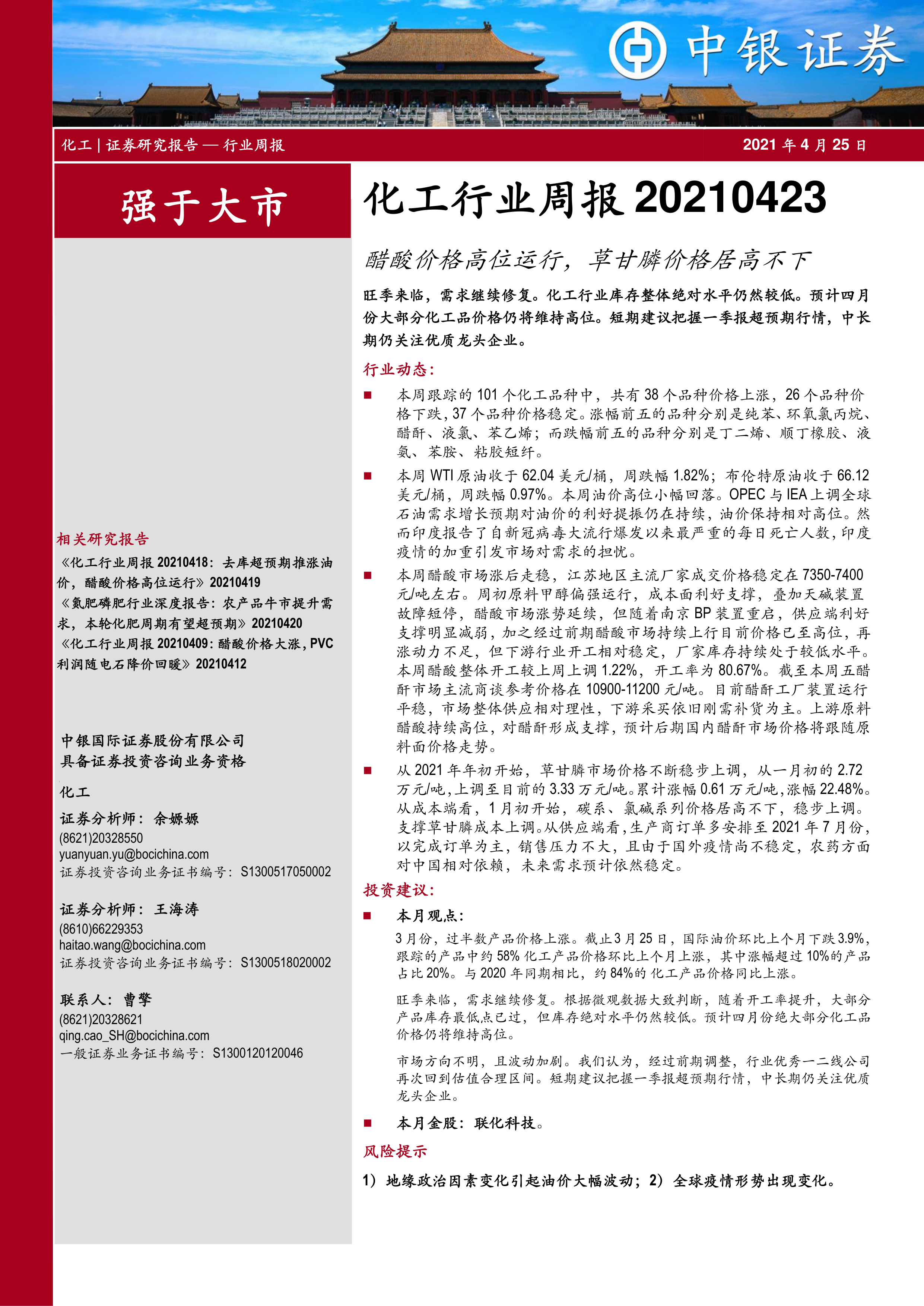 本报告的核心观点是:2021年4月,化工行业整体表现强于大市,大部分化工产品价格维持高位,但市场方向不明,波动加剧。短期内建议关注一季报超预期行情,中长期关注优质龙头企业。