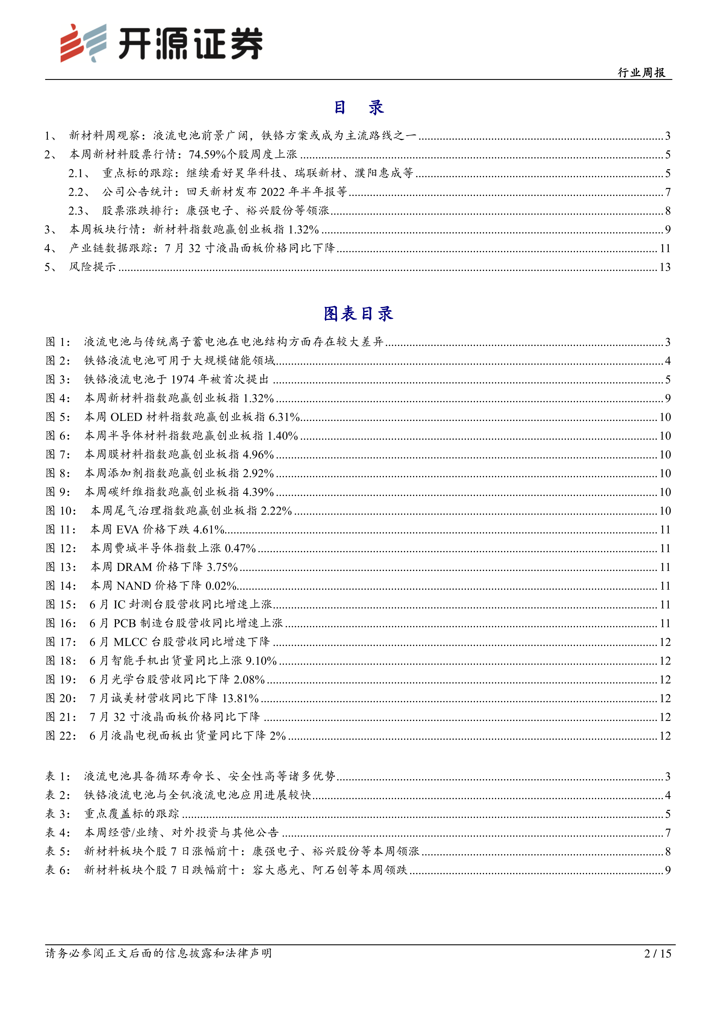 本报告对新材料行业,特别是液流电池市场进行了深入分析。报告认为,液流电池,尤其是铁铬液流电池,具有广阔的市场前景,并对相关上游材料企业的发展带来利好。同时,报告对本周新材料市场行情进行了回顾和分析,重点跟踪了几家新材料公司,并提供了相应的风险提示。 投资者应结合自身情况,谨慎决策。 报告中大量的数据和图表为分析提供了有力支撑,为投资者提供了较为全面的行业信息和投资参考。