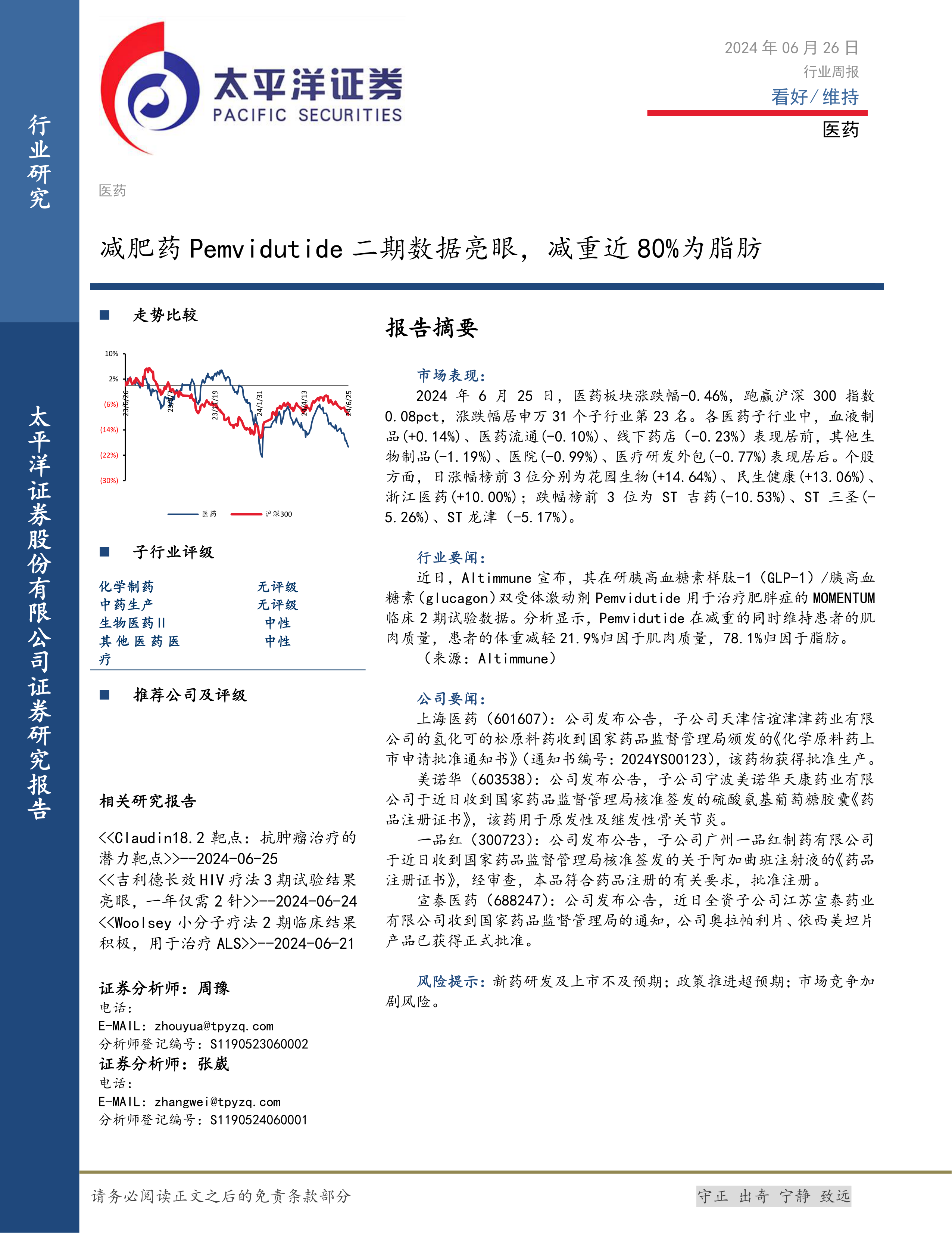 本报告对2024年6月26日医药行业进行了简要分析。报告指出,医药行业整体表现平稳,但细分领域差异显著。Pemvidutide二期临床试验数据亮眼,为减肥药领域带来积极信号。部分子行业表现较好,部分表现较差,个股波动剧烈。报告提供了市场走势、子行业评级、行业及公司要闻等信息,但未给出明确的投资建议,投资者需结合自身情况进行判断。 需要注意的是,报告信息来源于公开资料,其准确性和完整性无法保证,投资者需谨慎参考。