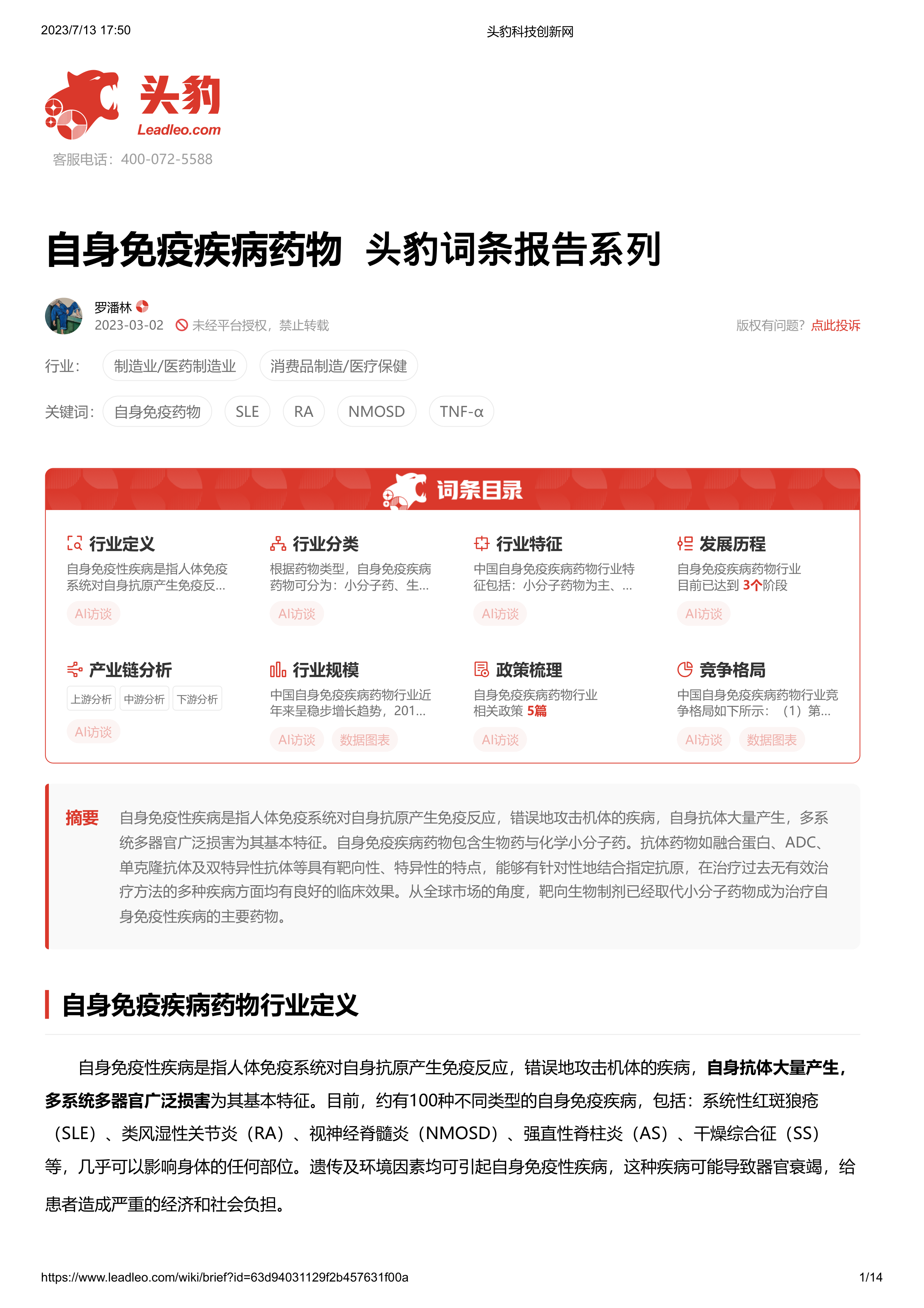 这份报告的核心观点是:中国自身免疫疾病药物市场规模持续增长,但市场结构与全球市场存在差异,小分子药物占据主导地位,生物药市场潜力巨大。未来市场增长将由患者基数增长、生物技术突破以及鼓励性政策共同驱动,但同时也面临着激烈的市场竞争。
