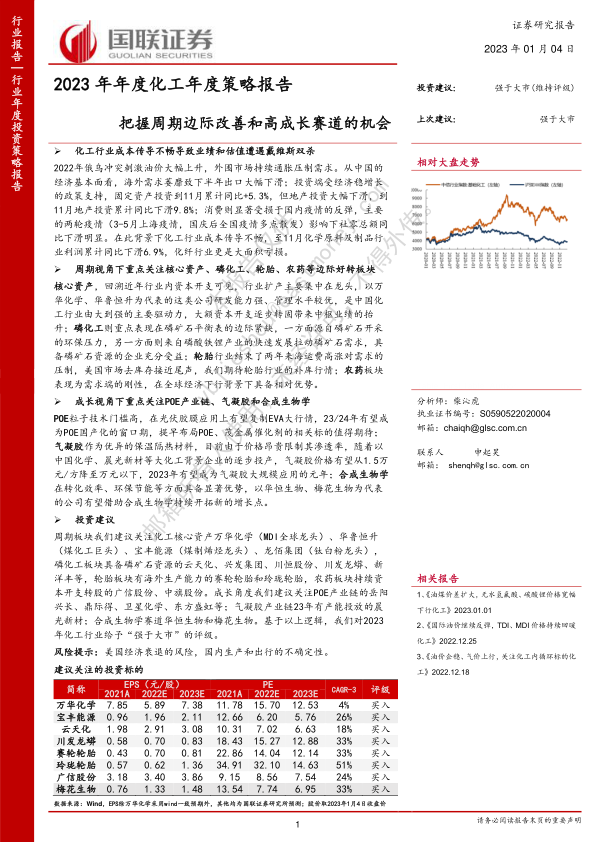 周期板块我们建议关注化工核心资产万华化学(MDI全球龙头)、华鲁恒升(煤化工巨头)、宝丰能源(煤制烯烃龙头)、龙佰集团(钛白粉龙头),磷化工板块具备磷矿石资源的云天化、兴发集团、川恒股份、川发龙蟒、新洋丰等,轮胎板块有海外生产能力的赛轮轮胎和玲珑轮胎,农药板块持续资本开支转股的广信股份、中旗股份。成长角度我们建议关注POE产业链的岳阳兴长、鼎际得、卫星化学、东方盛虹等;气凝胶产业链23年有产能投放的晨光新材;合成生物学赛道华恒生物和梅花生物。基于以上逻辑,我们对2023年化工行业给予“强于大市”的评级。