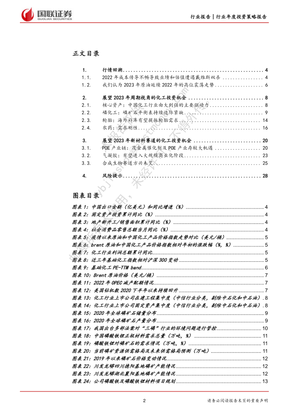 本报告基于对2022年化工行业现状的深入分析以及对2023年宏观经济和行业发展趋势的预测,提出了相应的投资建议。报告强调了周期性复苏和结构性增长的双重特征,并建议投资者关注周期性边际改善的板块和高成长赛道,同时需注意潜在的风险因素。报告中提供的统计数据和市场分析,为投资者提供了较为全面的参考信息,但投资者仍需进行独立判断和风险评估。
