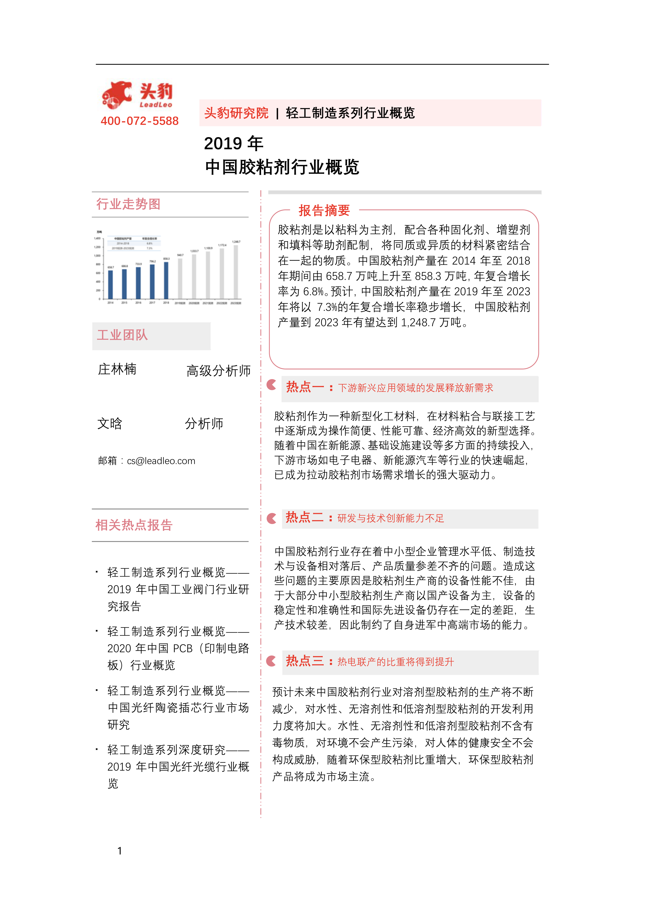 本报告基于头豹研究院发布的《2019年中国胶粘剂行业概览》,运用统计数据和专业分析,对中国胶粘剂行业市场现状、发展趋势及竞争格局进行深入解读。报告核心观点如下: