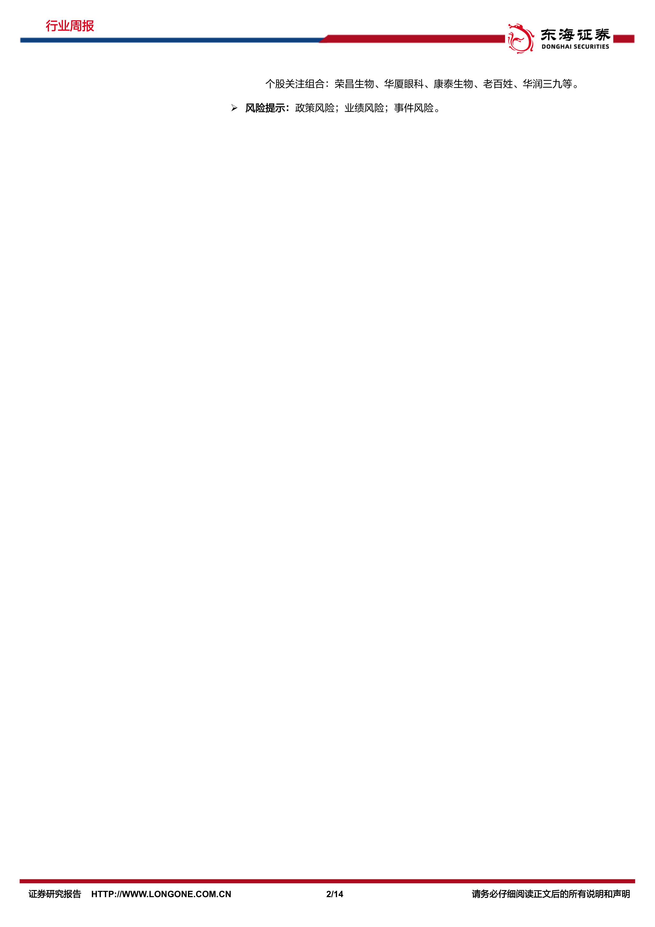 报告最后列出了投资医药生物行业的风险提示,包括政策风险(政策推进的不确定性,集采政策的影响)、业绩风险(上市公司业绩不及预期,并购整合进展不及预期,产品研发进展不及预期)以及事件风险(突发事件的影响,新冠疫情的不确定性)。