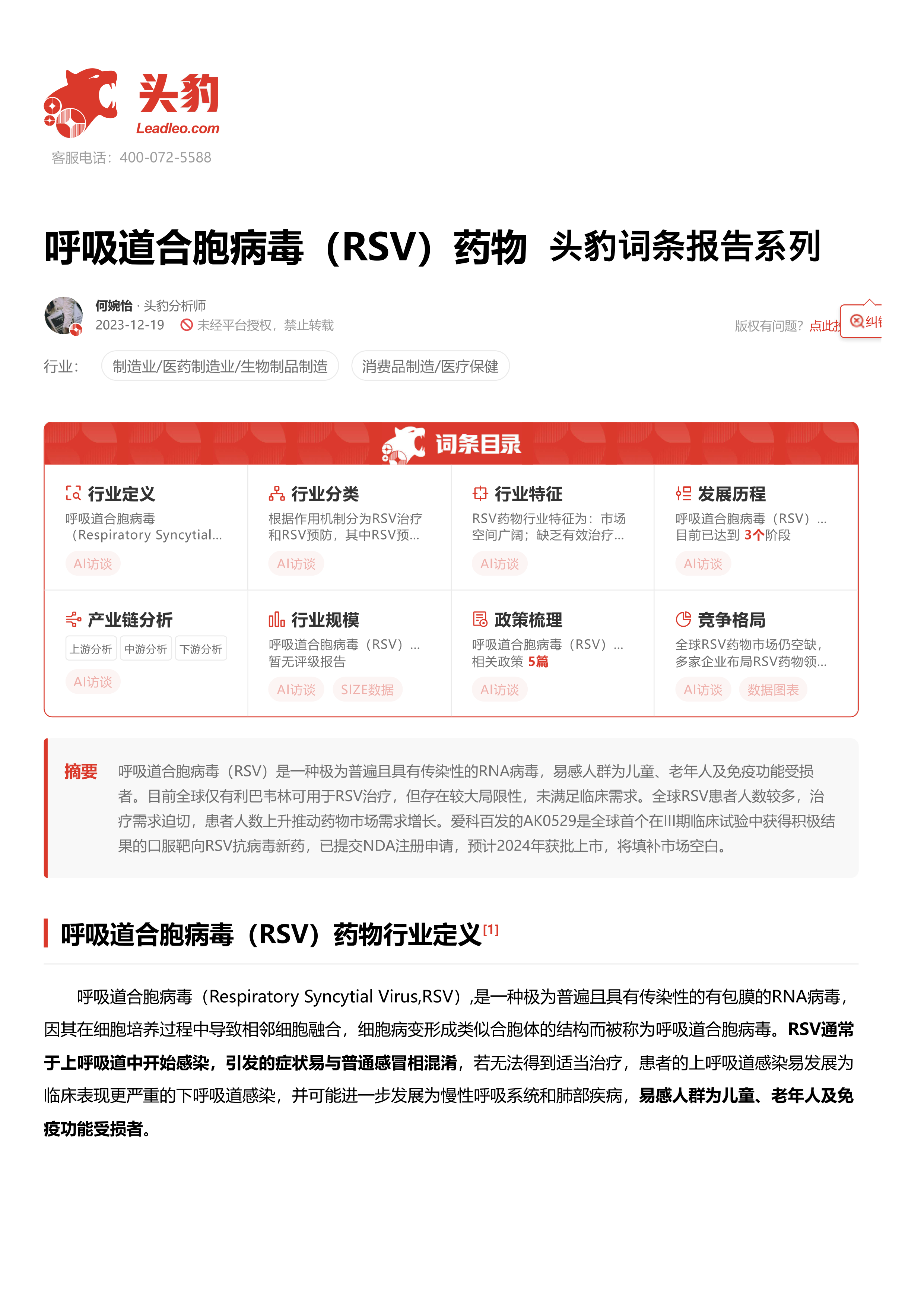 呼吸道合胞病毒(RSV)药物 头豹词条报告系列