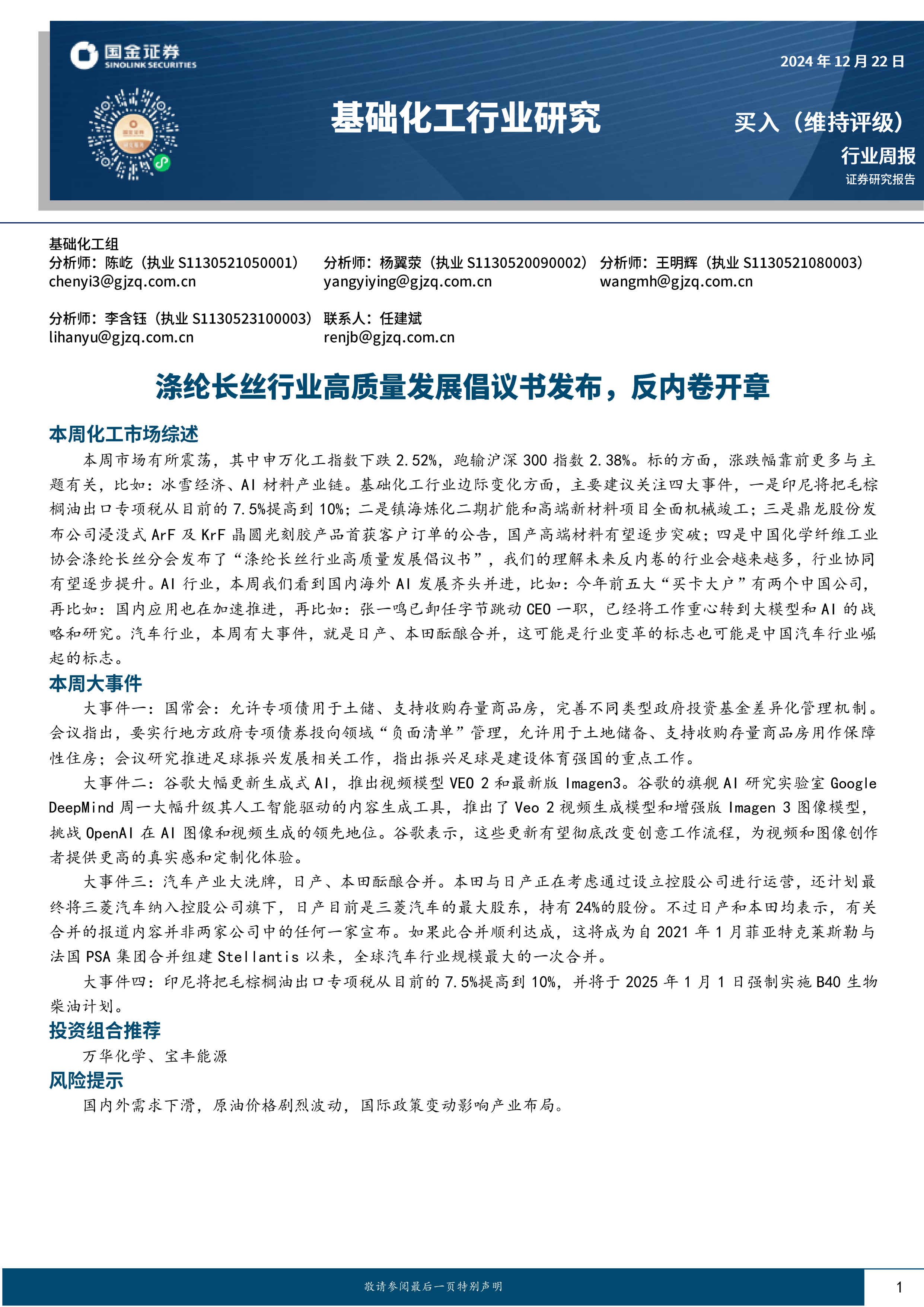 本周市场有所震荡,其中申万化工指数下跌2.52%,跑输沪深300指数2.38%。标的方面,涨跌幅靠前更多与主题有关,比如:冰雪经济、AI材料产业链。基础化工行业边际变化方面,主要建议关注四大事件,一是印尼将把毛棕榈油出口专项税从目前的7.5%提高到10%;二是镇海炼化二期扩能和高端新材料项目全面机械竣工;三是鼎龙股份发布公司浸没式ArF及KrF晶圆光刻胶产品首获客户订单的公告,国产高端材料有望逐步突破;四是中国化学纤维工业协会涤纶长丝分会发布了“涤纶长丝行业高质量发展倡议书”,我们的理解未来反内卷的行业会越来越多,行业协同有望逐步提升。AI行业,本周我们看到国内海外AI发展齐头并进,比如:今年前五大“买卡大户”有两个中国公司,再比如:国内应用也在加速推进,再比如:张一鸣已卸任字节跳动CEO一职,已经将工作重心转到大模型和AI的战略和研究。汽车行业,本周有大事件,就是日产、本田酝酿合并,这可能是行业变革的标志也可能是中国汽车行业崛起的标志。