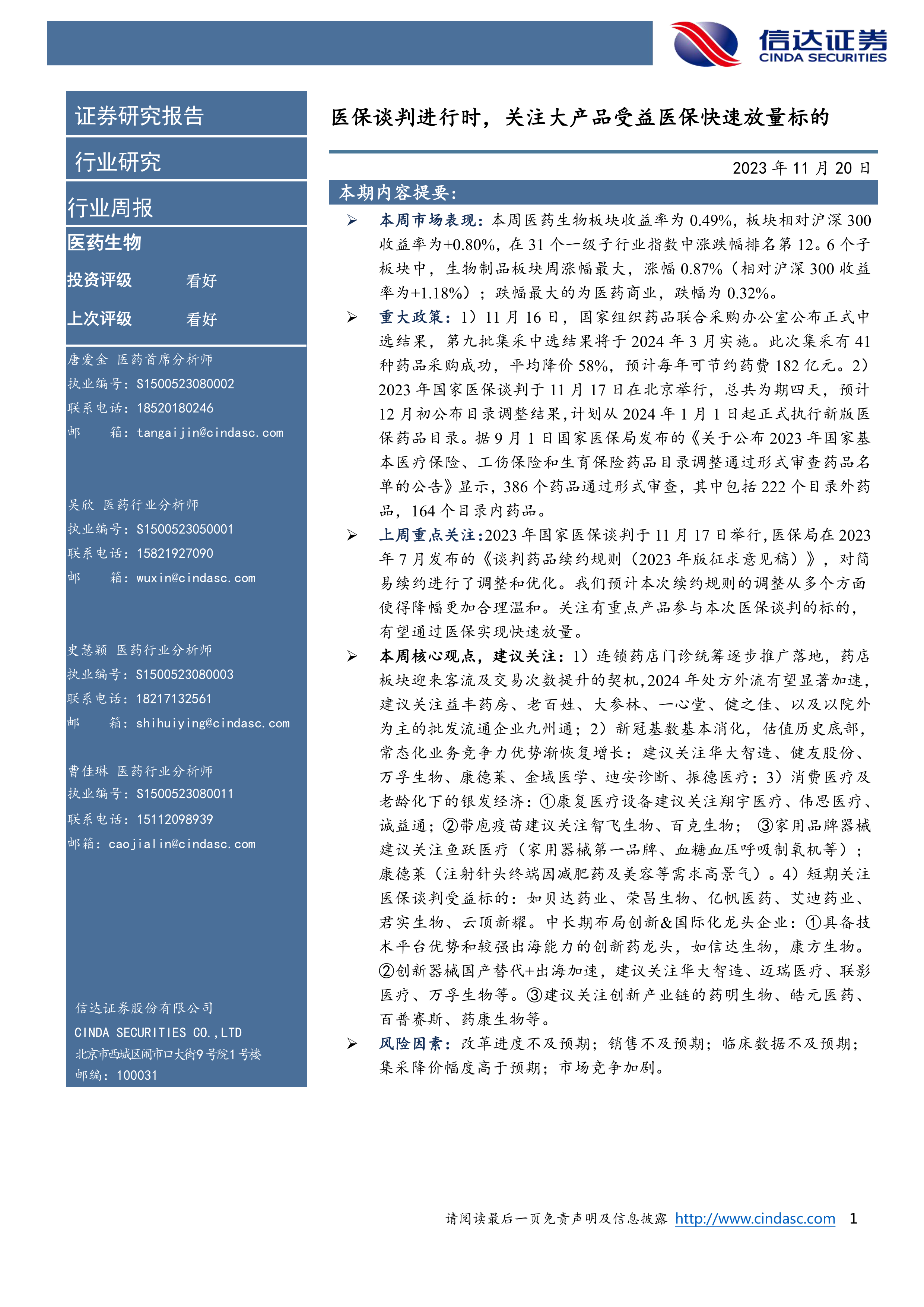 上周重点关注:2023年国家医保谈判于11月17日举行,医保局在2023年7月发布的《谈判药品续约规则(2023年版征求意见稿)》,对简易续约进行了调整和优化。我们预计本次续约规则的调整从多个方面使得降幅更加合理温和。关注有重点产品参与本次医保谈判的标的,有望通过医保实现快速放量。