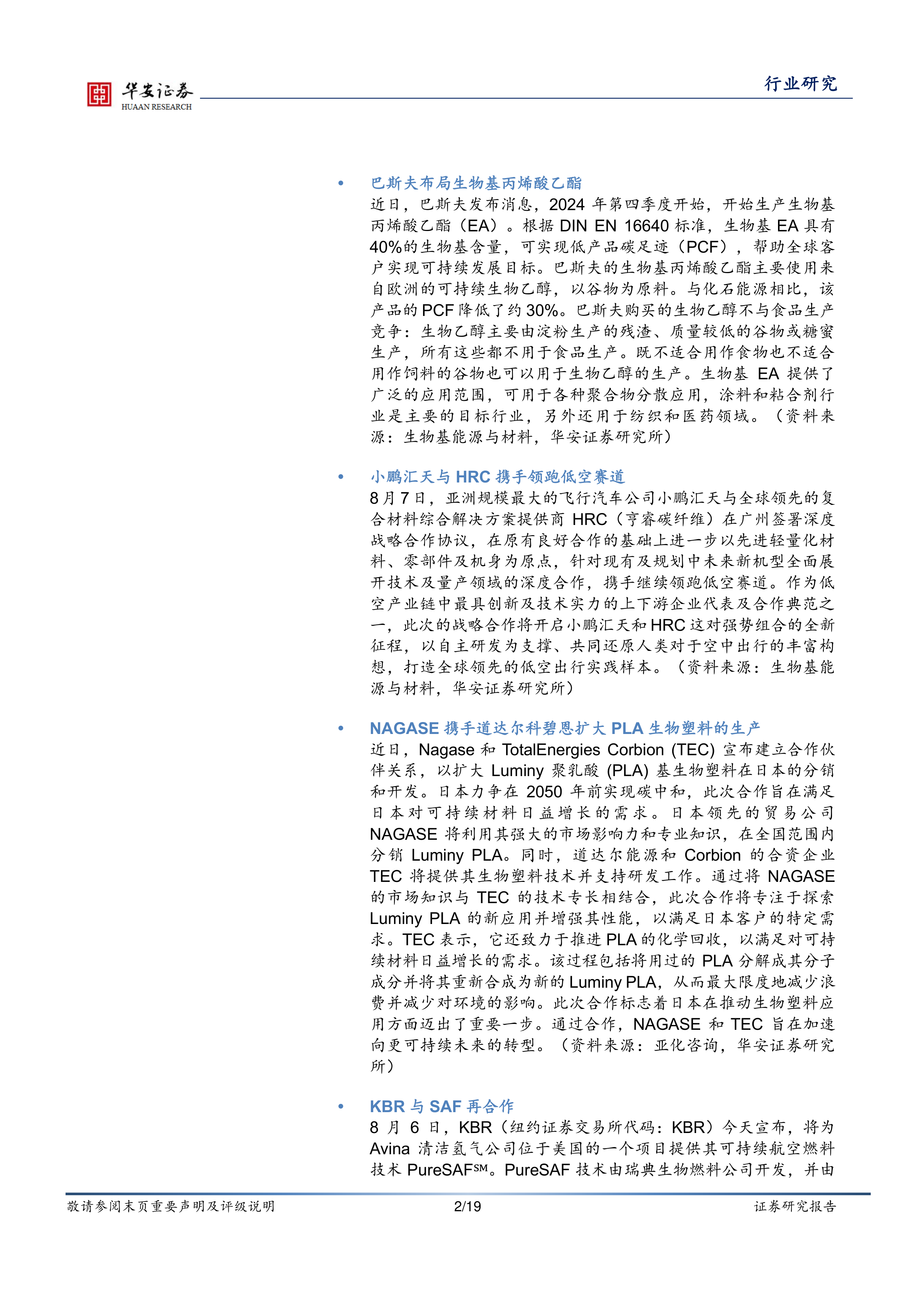 近日,巴斯夫发布消息,2024年第四季度开始,开始生产生物基丙烯酸乙酯(EA)。根据DIN EN16640标准,生物基EA具有40%的生物基含量,可实现低产品碳足迹(PCF),帮助全球客户实现可持续发展目标。巴斯夫的生物基丙烯酸乙酯主要使用来自欧洲的可持续生物乙醇,以谷物为原料。与化石能源相比,该产品的PCF降低了约30%。巴斯夫购买的生物乙醇不与食品生产竞争:生物乙醇主要由淀粉生产的残渣、质量较低的谷物或糖蜜生产,所有这些都不用于食品生产。既不适合用作食物也不适合用作饲料的谷物也可以用于生物乙醇的生产。生物基EA提供了广泛的应用范围,可用于各种聚合物分散应用,涂料和粘合剂行业是主要的目标行业,另外还用于纺织和医药领域。(资料来源:生物基能源与材料,华安证券研究所)
