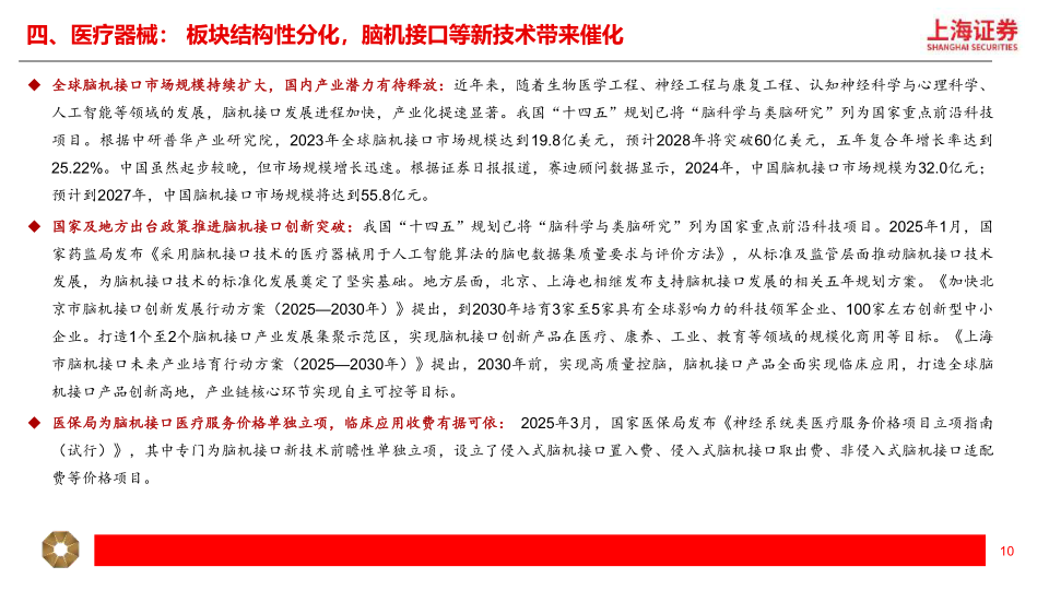 医疗器械板块呈现结构性分化,医疗设备板块受政策和市场因素影响,业绩阶段性承压,但2025年Q1招投标市场规模大幅增长。 高值耗材板块相对稳健。 脑机接口等新技术带来增量,市场规模持续扩大,国家和地方政策也积极推动其发展,医保局为脑机接口医疗服务价格单独立项。