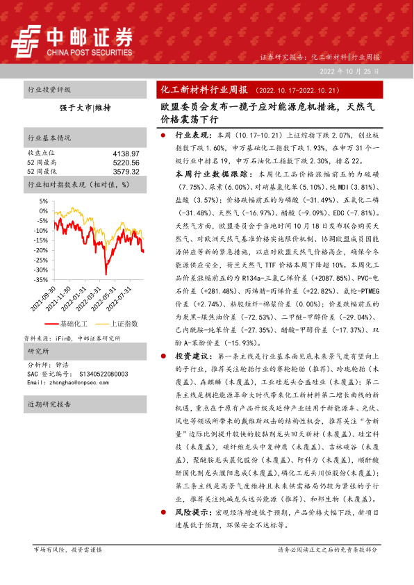 化工新材料行业周报:欧盟委员会发布一揽子应对能源危机措施,天然气价格震荡下行