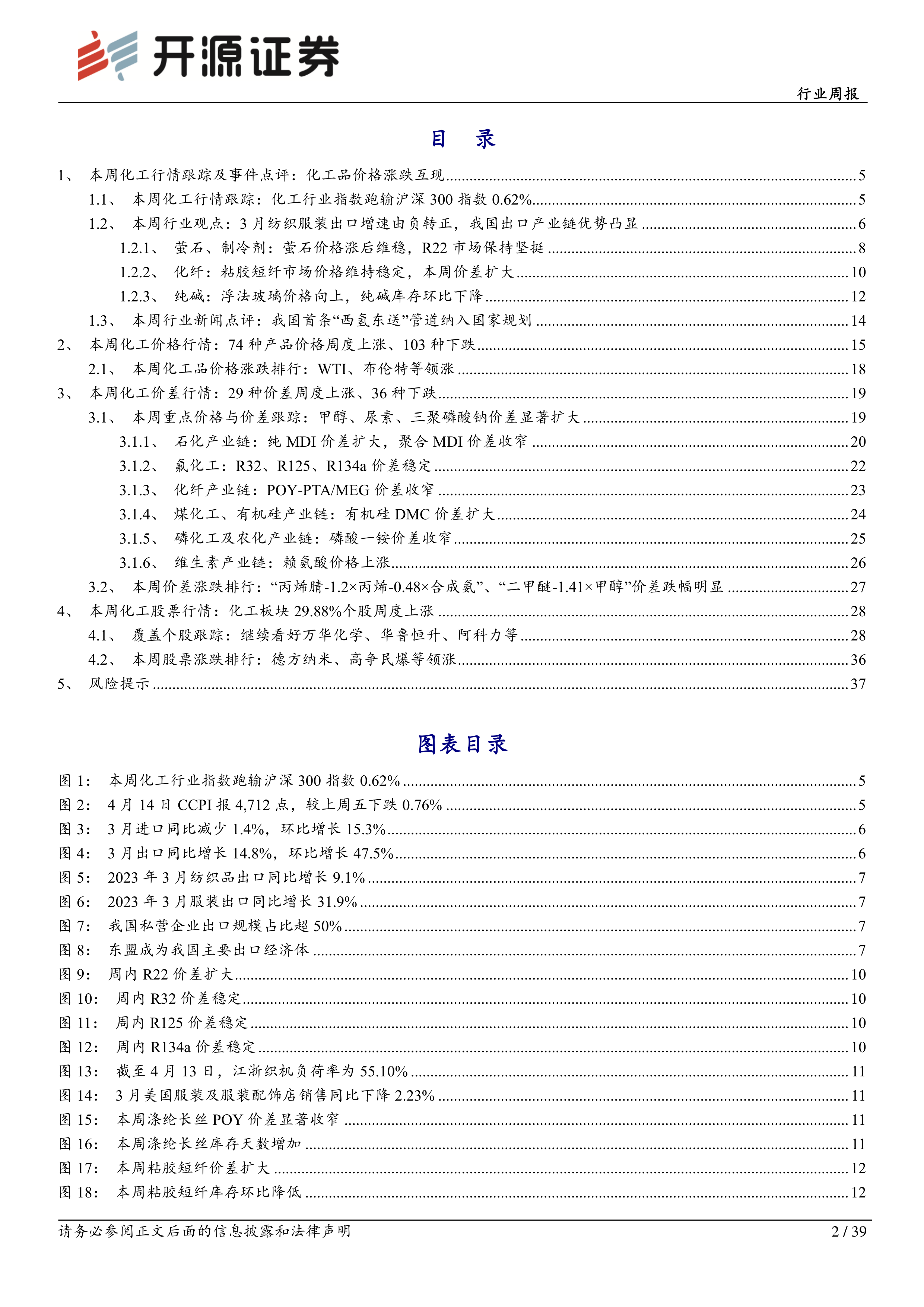 本报告通过对3月份中国出口数据、化工产品价格及价差、化工股票行情等多方面数据的分析,得出中国出口强劲增长,外需回暖趋势显著,这将利好基础化工行业,特别是化纤行业。国内浮法玻璃和纯碱市场也出现积极信号。然而,宏观经济下行、下游需求疲软以及油价波动等风险依然存在。 报告还对部分重点化工企业进行了跟踪分析,并提供了投资评级建议。 投资者需谨慎参考,并结合自身情况做出投资决策。