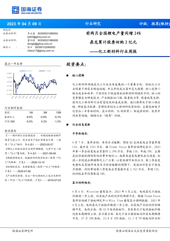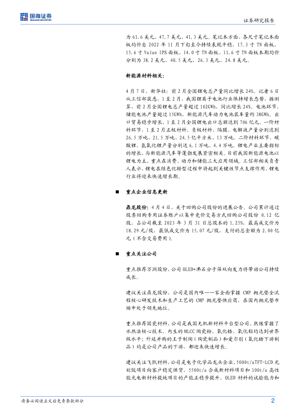 化工新材料行业周报:前两月全国锂电产量同增24% 鼎龙累计股票回购2亿元