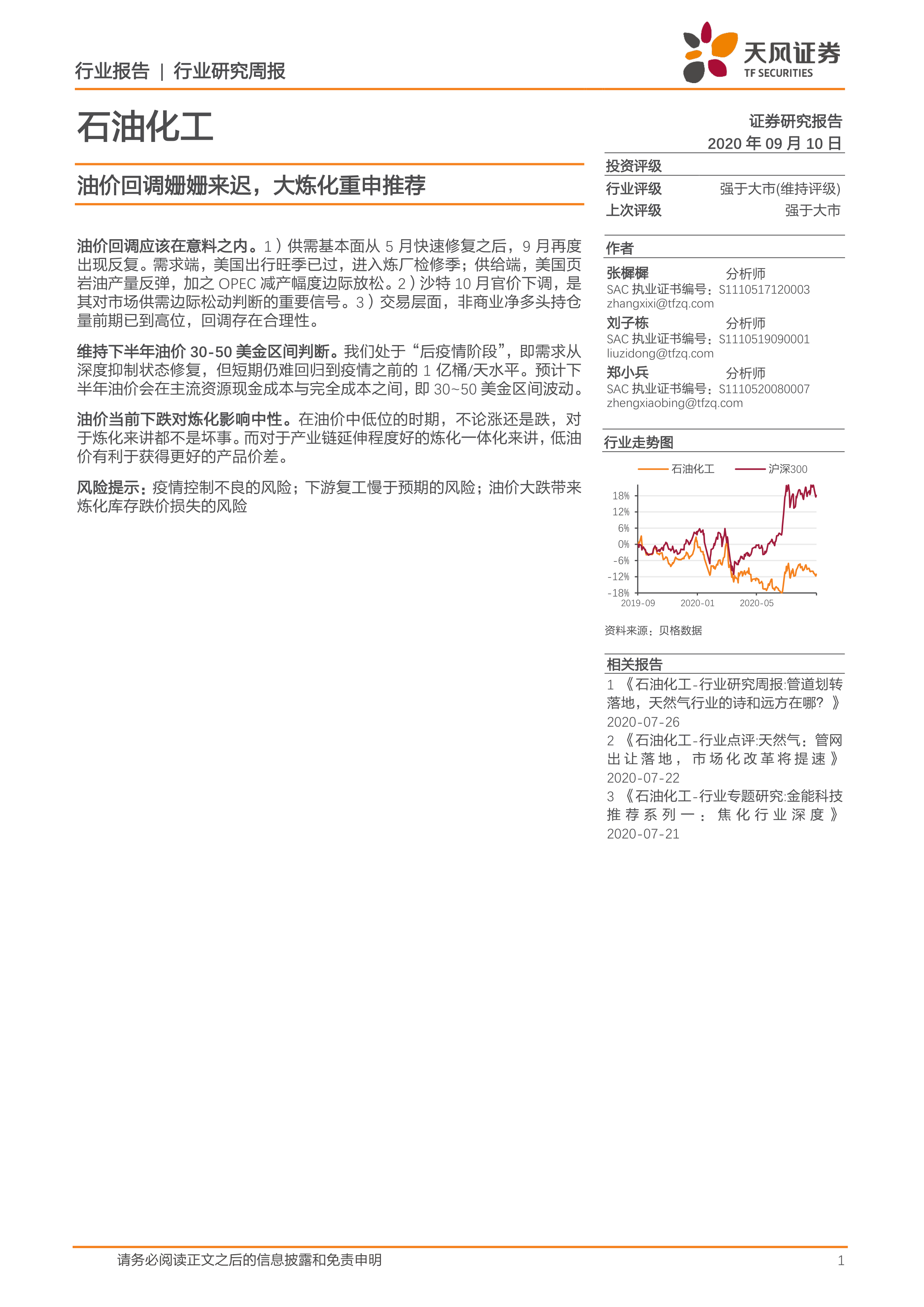 石油化工行业研究周报:油价回调姗姗来迟,大炼化重申推荐