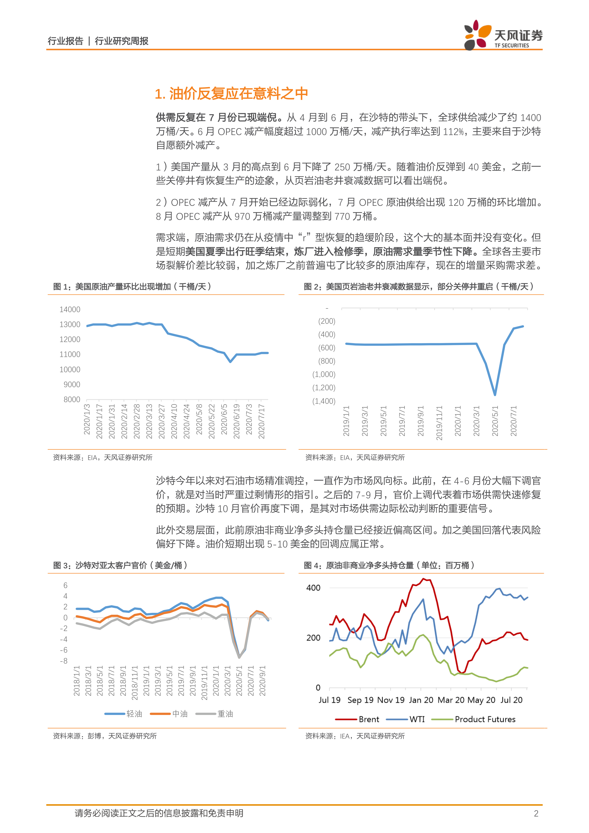 报告详细分析了油价反复的原因。从4月到6月,全球供给大幅减少,但7月开始OPEC减产力度边际弱化,美国页岩油产量也出现反弹。需求方面,虽然整体需求仍在恢复,但短期内受到美国出行旺季结束和炼厂检修季的影响,需求季节性下降。图表数据直观地展现了美国原油产量、页岩油老井衰减数据、沙特官价以及原油非商业净多头持仓量的变化趋势,有力地支撑了报告的结论。